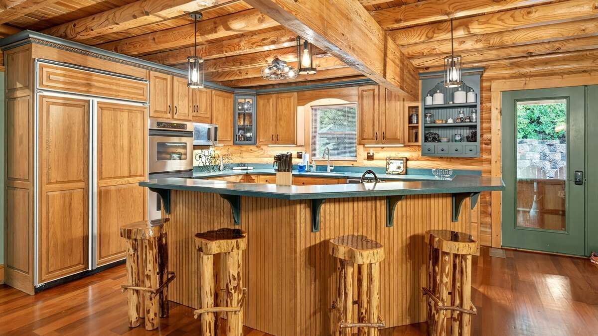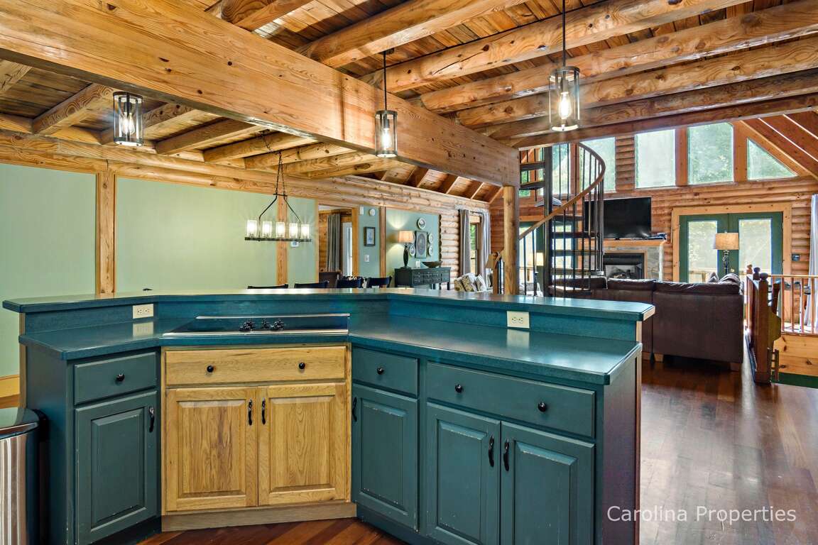 Lazy Bear Lodge is a spacious, family-friendly log home with three bedrooms, three full baths, and a large open-concept kitchen, dining, and living room with a gas fireplace and vaulted ceiling. All bedrooms are large and have new king-size beds for comfort. The lower level has a second den area, third full bathroom, laundry room, open playroom with pool table, card table and chairs, games, etc. The main living area is on the first floor. It has a full kitchen with modern appliances (double oven, stove, microwave, toaster, coffee maker) and a full complement of pots, plates, cutlery, and silverware. The dining table has seating for 10, and the kitchen bar has seating for four (If additional seats are needed, there is a card table with four chairs in the basement in the closet under the stairs).