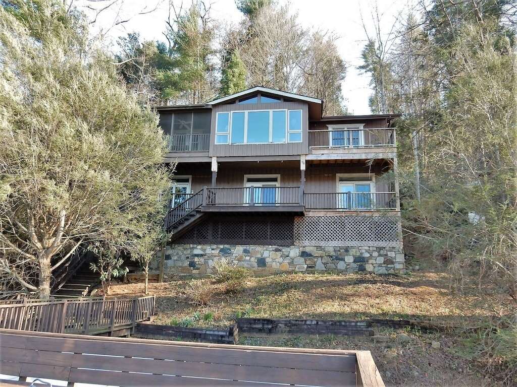 Loose Moose Lodge is a four-bedroom, three-bath lakefront home that sits on the south side of Lake Lure on the main channel. Amazing views of the mountains and lake! This is one of the original cabins on the lake and has a rustic lodge feel. If you yearn to breathe fresh air and be on beautiful Lake Lure, Loose Moose Lodge is a great choice. Relax on either of the two back decks in this very serene setting that overlooks Lake Lure's beautiful mountains and waters.
