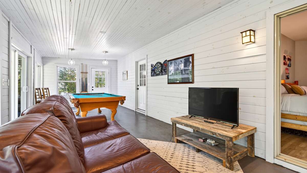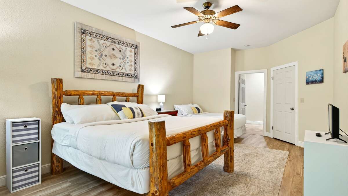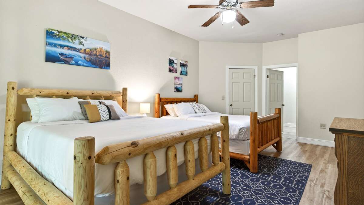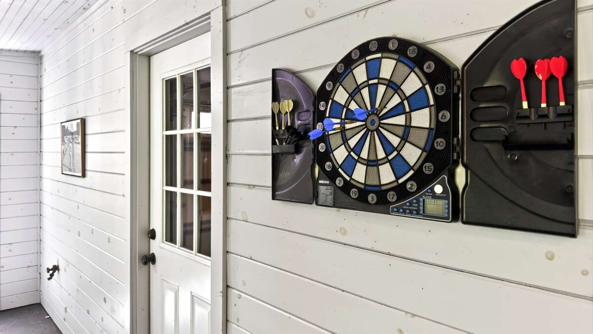 The lower level offers two additional bedrooms, one with a king-size bed and the other with two queen-size beds. This level has a full bath with easy access for each bedroom. Each bedroom in this home has a flat-screen TV. The lower level can serve as your space to unwind privately before joining the group, or open the doors to the game room and turn this into a social haven!