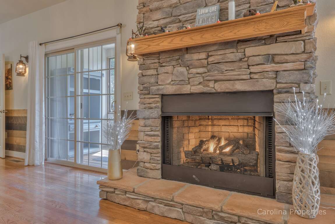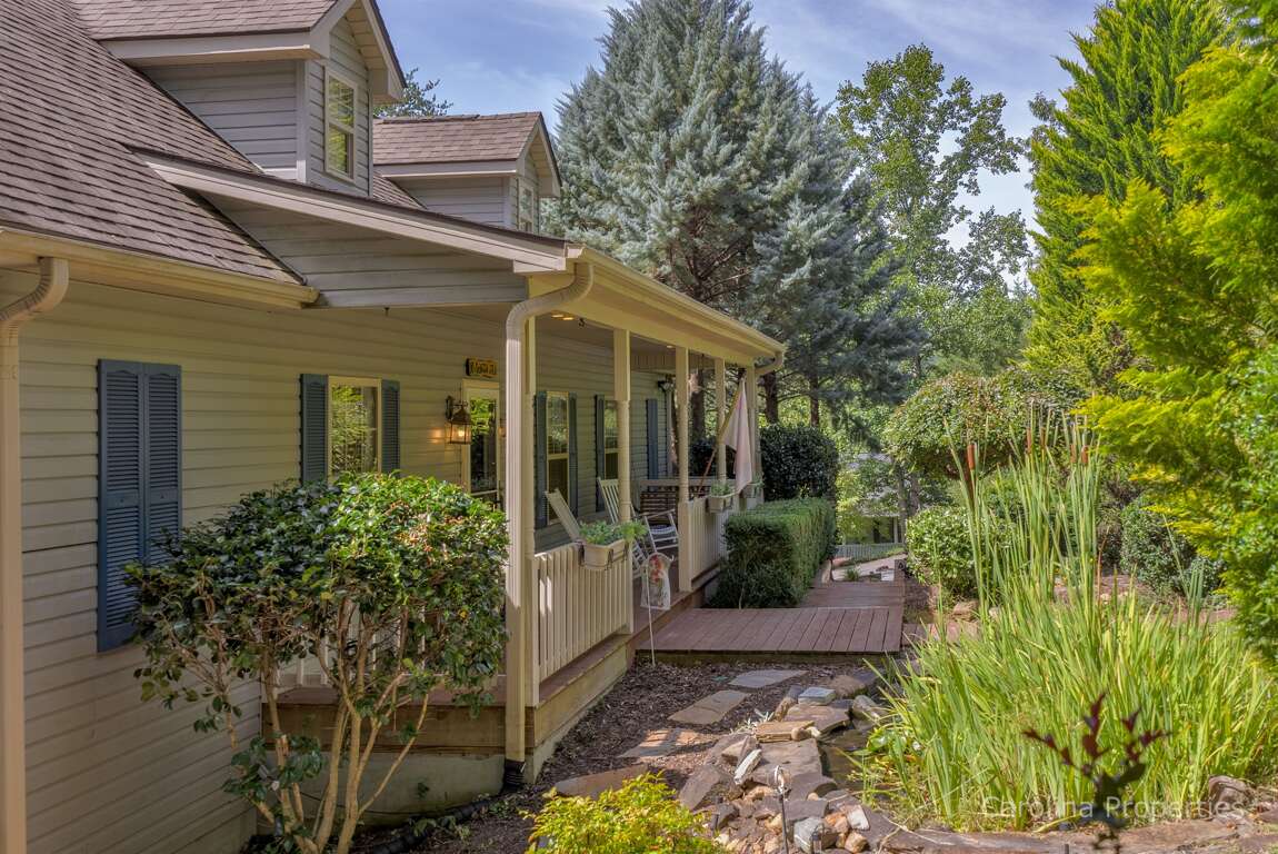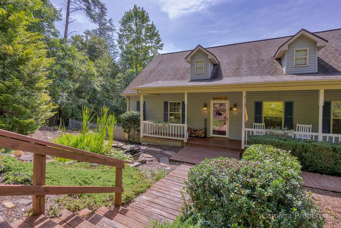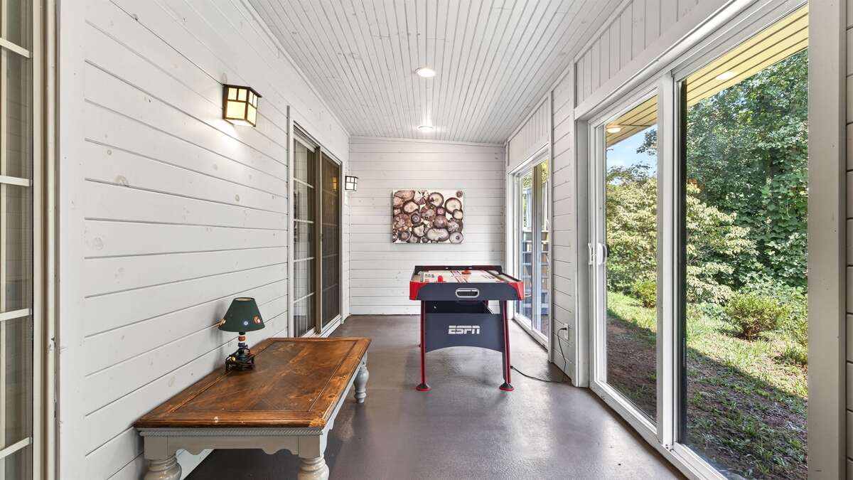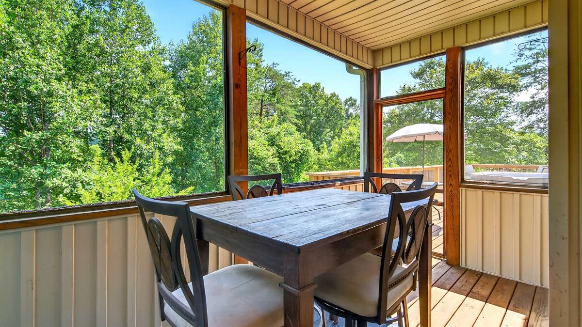 Off The Clock is located on the 6th fairway of the renowned Apple Valley Golf Course at Rumbling Bald Resort in Lake Lure! This home boasts an exceptional open floor plan with vaulted ceilings, spacious rooms, and abundant outdoor living areas, including a covered front porch complete with porch swing and cottage-style walkways, a screened back porch, and an enclosed patio on the lower level. The enclosed patio has a beautifully designed pool table, air hockey table, television, and seating area!