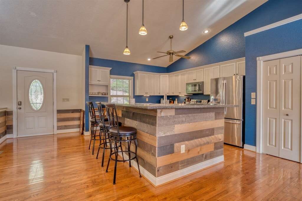 The main level of Off The Clock has a beautiful stone fireplace with gas logs, a half bath, a semi-open office/ school zone for anyone needing to work while away from home, and a master suite with a king-size bed. There is an open, fully functional kitchen with a large pantry, so don't hold back; bring everything you need for your cherished family recipes. This is a perfect home for your family trip! The grill is brand new and in an ideal location. Plus it's hooked up to the main gas line, so you don't have to worry about running low on propane.