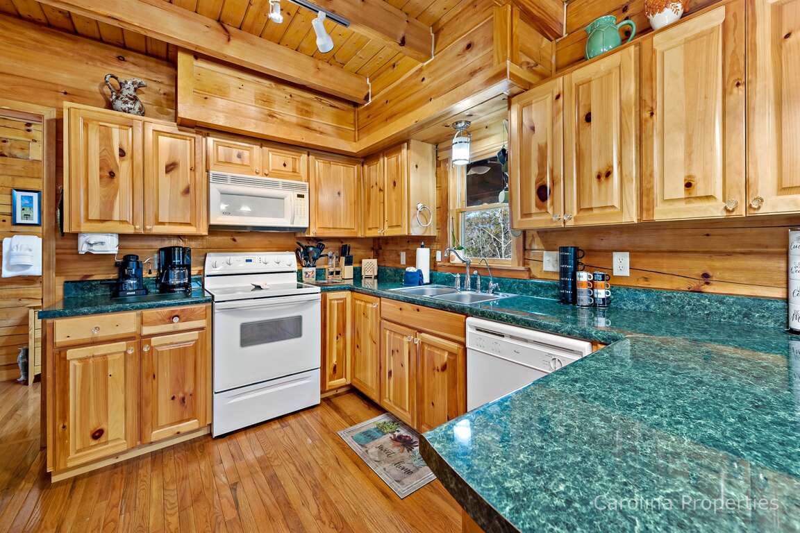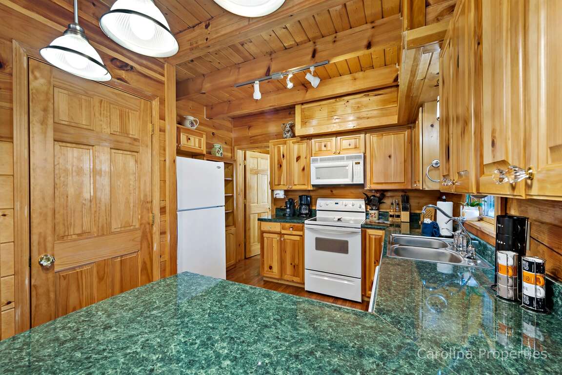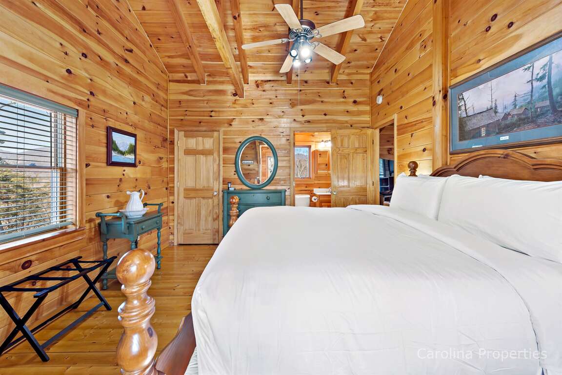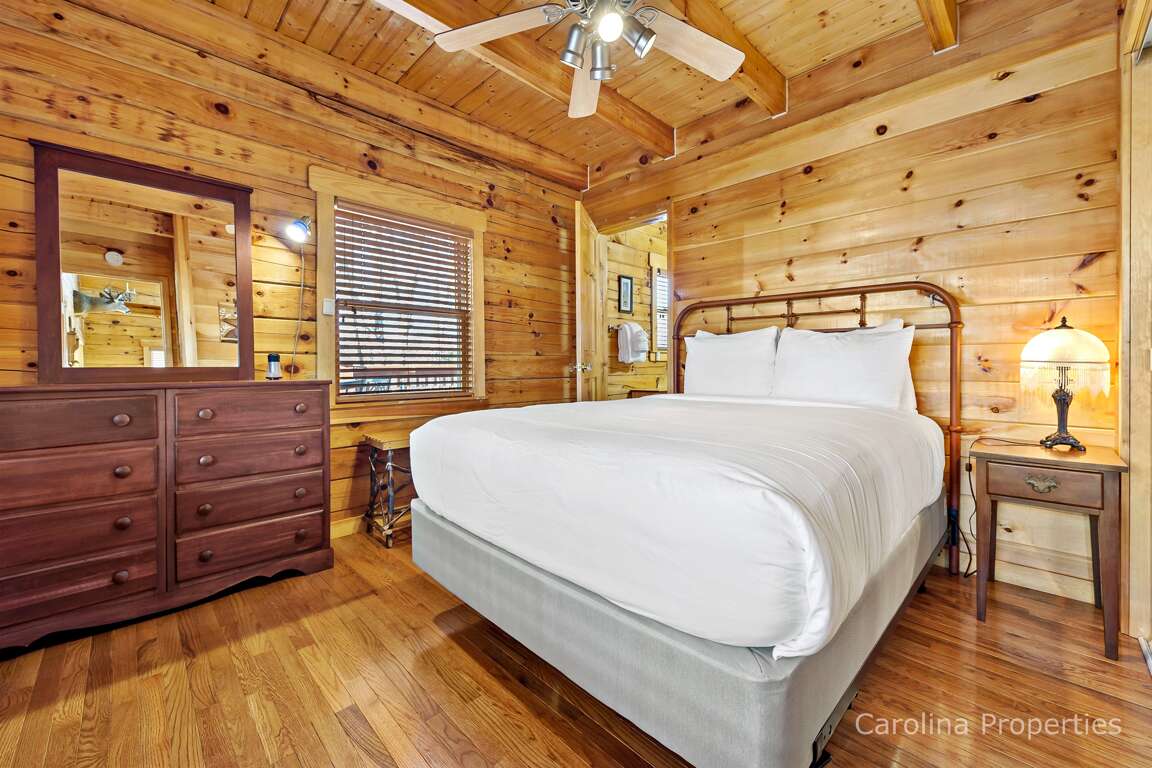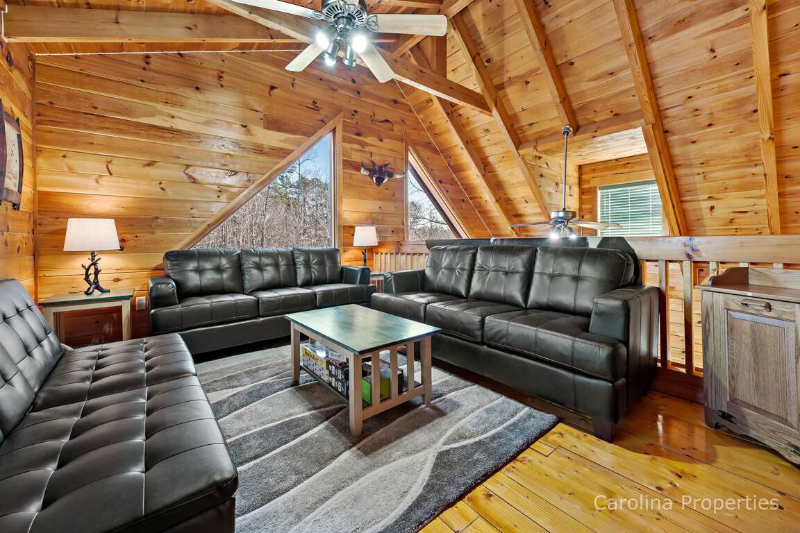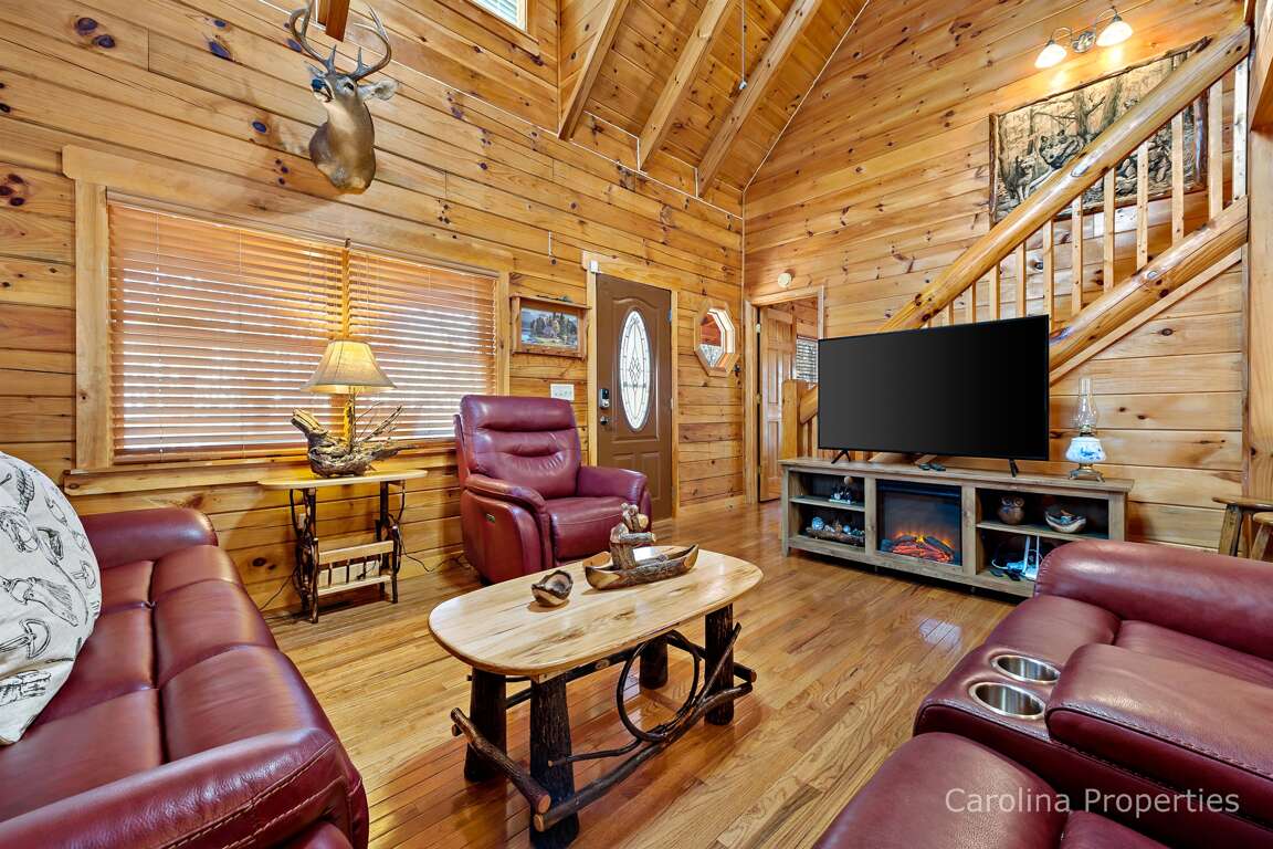 Outlander Cabin offers a great room with a cathedral ceiling, a gas log fireplace, Wi-Fi, and a flat-screen TV. The dining room seats 6, and the breakfast bar has two additional seats. This property offers a well-appointed, functional kitchen. The main level features a master bedroom with a queen bed and an adjoining bathroom, which is also accessible from the main living area. Upstairs, you’ll find a loft overlooking the great room with a flat-screen TV, a guest bedroom with a king bed, and a full bathroom on this level. The lower level offers another bedroom with a king bed and a full bath.
