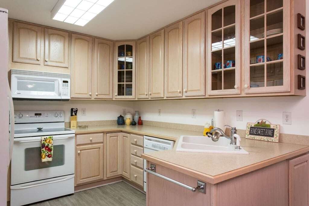 Upon entering, the dining room has seating for 4 (plus four stools at the kitchen bar area) and a lovely sitting area. Beyond is the living area, with additional seating, a gas fireplace, and a flat-screen TV (basic channels). Internet is also available. What the U-shaped kitchen lacks in size, it makes up for in the cabinet storage space while still offering the necessary full-size appliances (refrigerator, range, dishwasher, and microwave).