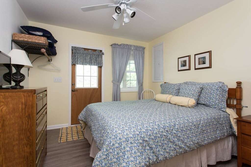 The king-bed suite has doors that open onto the lakeside deck, providing comfort and a perfect way to wake in the morning. The room also has a cozy club chair and an adjoining full bathroom.