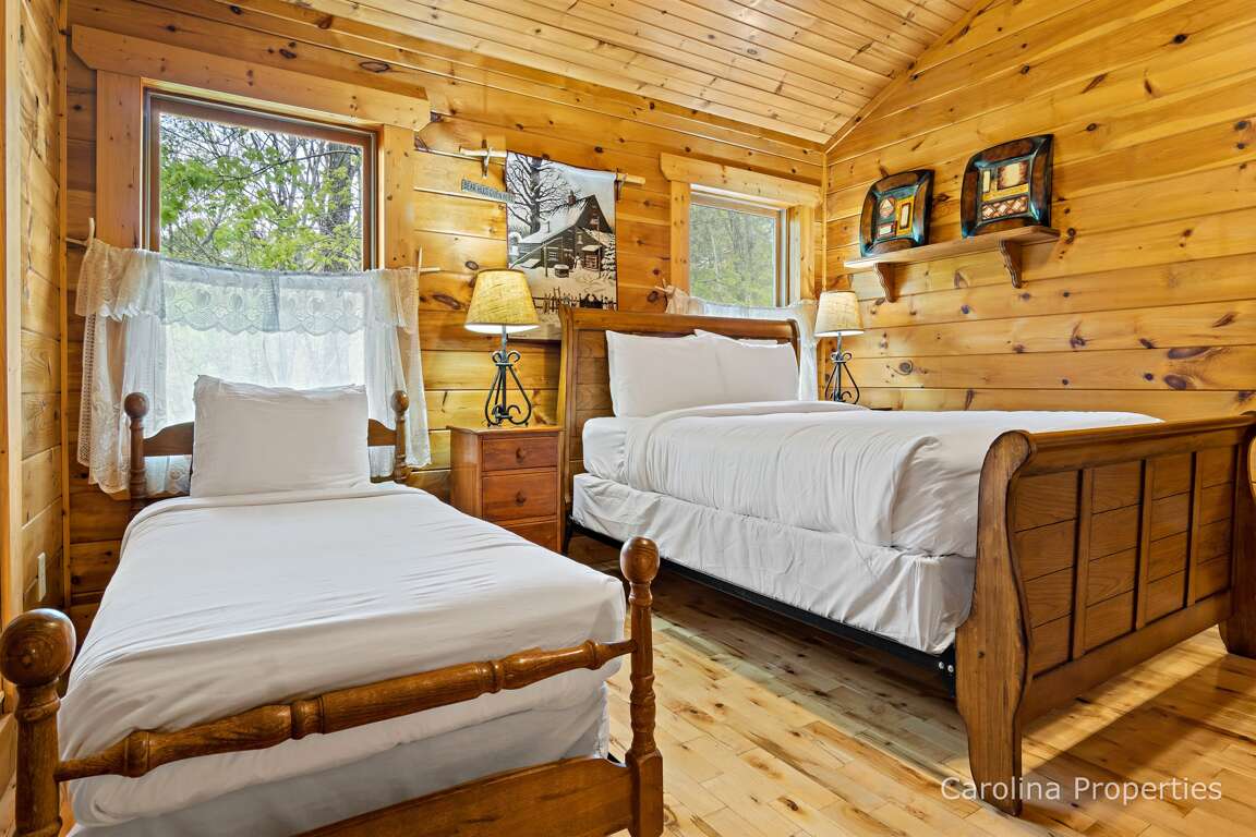 Guests will appreciate the two additional bedrooms on the upper level. One bedroom has a queen bed, and the other has a queen and a twin bed. A full bath (tub/shower combination) is located between these two bedrooms.