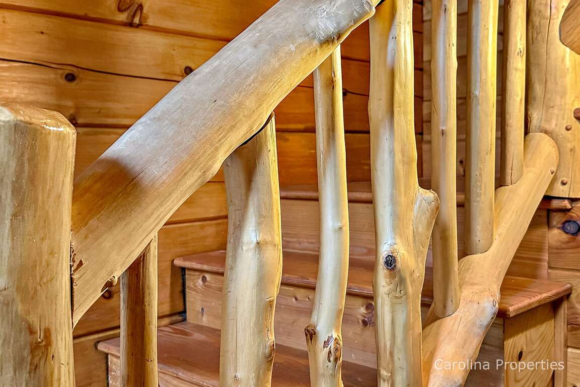 The wonderful two-story great room has beautiful wood floors, a floor-to-ceiling stone fireplace with gas logs, and locally crafted furniture. The living room features a gas log fireplace, comfortable seating, a large TV viewable from the kitchen, and a dining room table. The entire home is filled with extra special features you do not see in the average log home, and it is fast becoming one of our favorites! You will find a perfectly tucked-in library/reading area surrounded by natural wood and curvy staircase railings. Open and above the living room is a bright and cozy loft with an office work area for one or two who may need to keep up with work or business projects while still enjoying our beautiful area. This home does have Starlink WI-FI available.