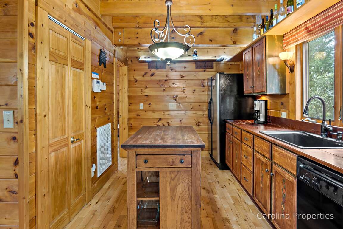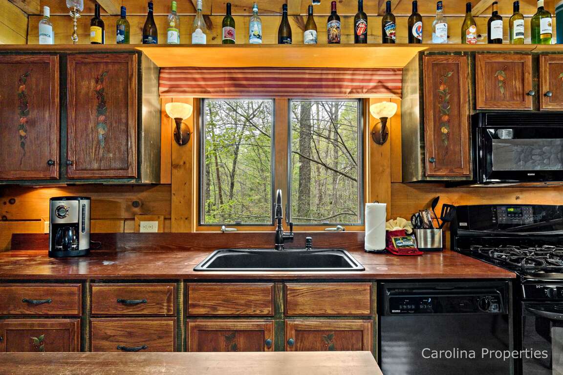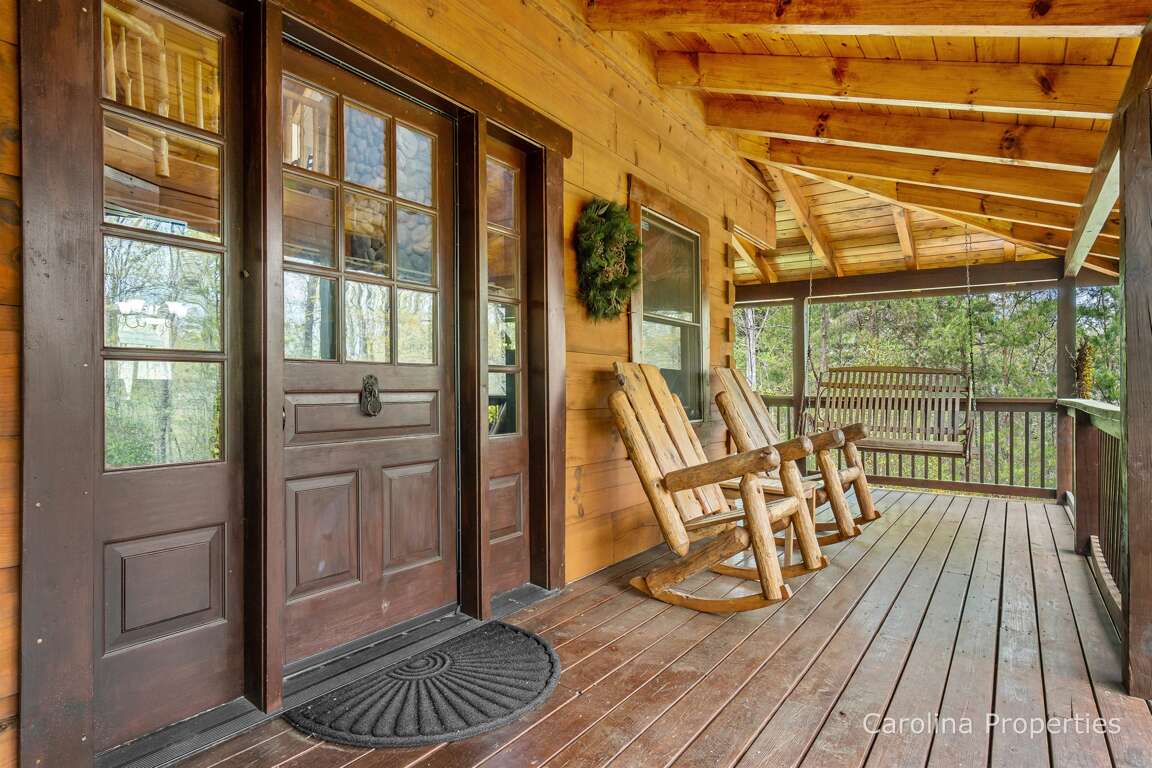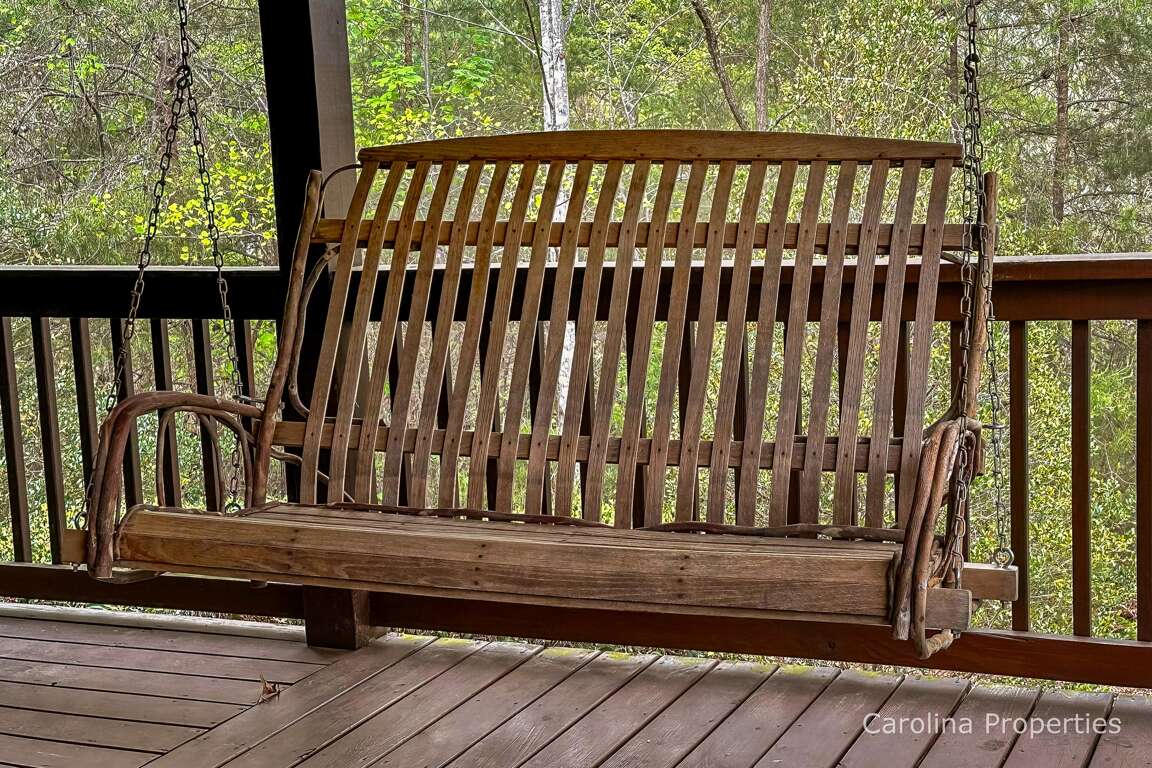 Covered porches surround the front and side of the cabin, and ample glass doors and windows offer soothing views of the woods beyond. You will enjoy the porch swing and extra-large rockers. There is also a back deck off the kitchen/dining area where guests can enjoy cooking on the gas BBQ grill with the sounds of nature.