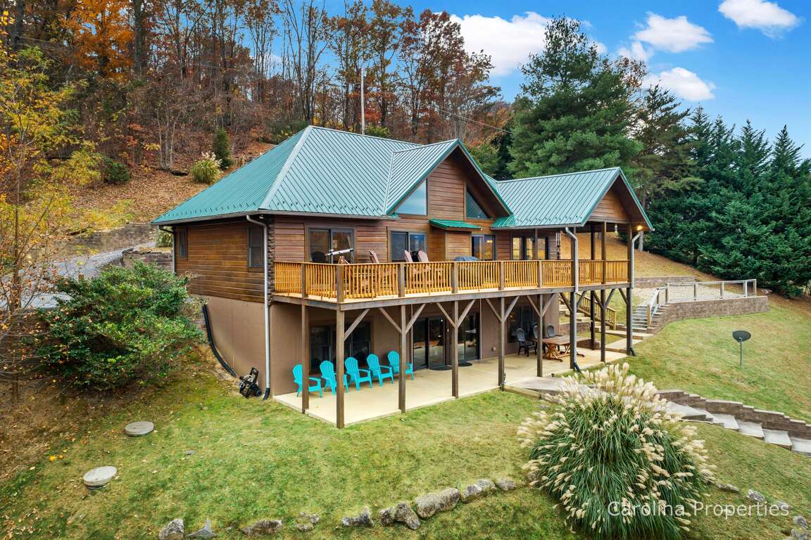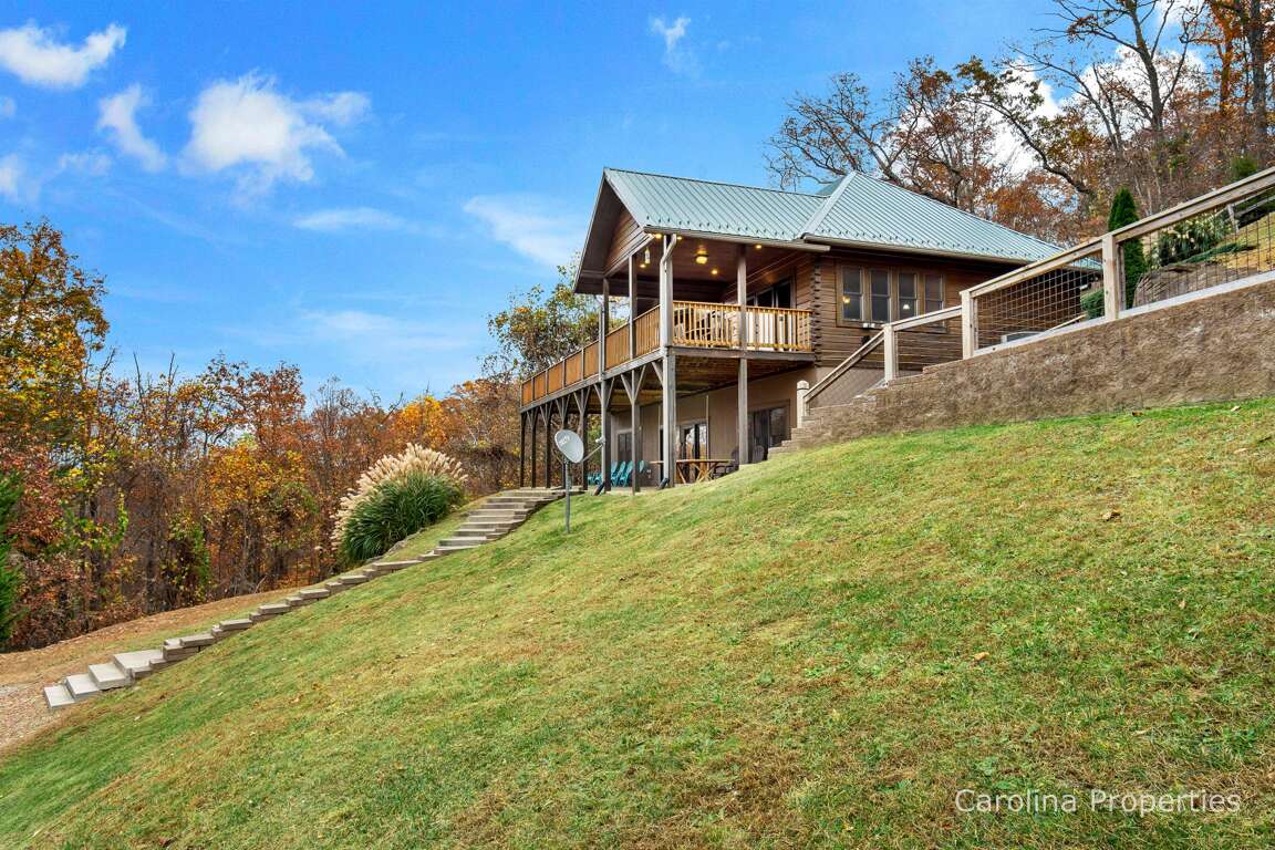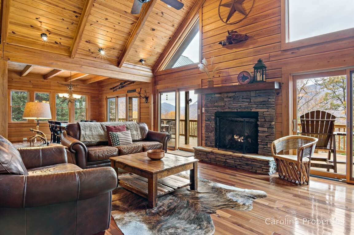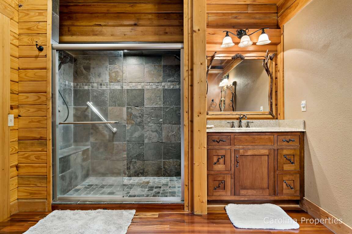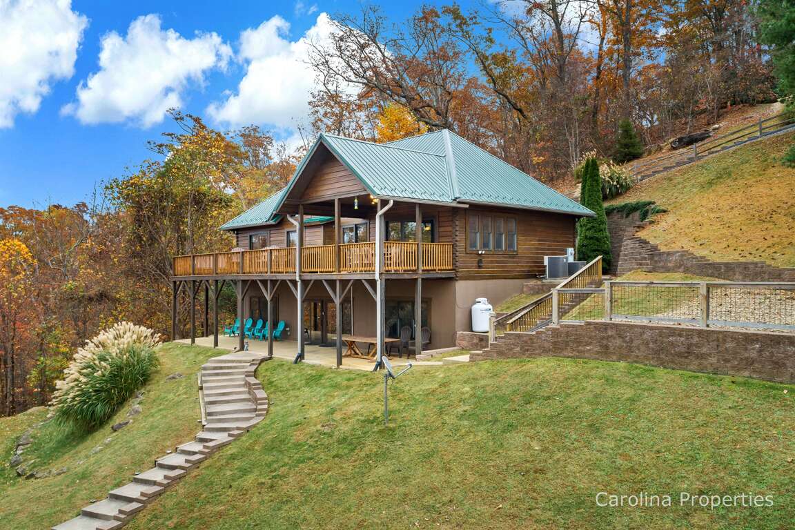 Symphony House is an incredibly beautiful log home with exceptional views of the Hickory Nut Gorge & Chimney Rock State Park in the heart of Lake Lure. It offers an open floor plan with soaring vaulted ceilings, a stone gas fireplace to enjoy during cooler weather seasons, Brazilian tiger hardwood floors, a massive granite kitchen island with seating to gather around, and custom cherry cabinets. The spacious master suite on the main level has a slate shower, two vanities, and a large walk-in closet. Sliding glass doors lead to the back deck, where you can grill and enjoy the view under the covered portion, which is perfect for entertaining. The lower features two oversized bedrooms, each with a full bathroom. Large recreation room with a pool table that leads to the concrete patio with even more room to enjoy the outdoors.