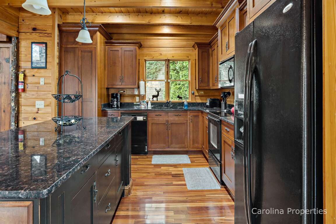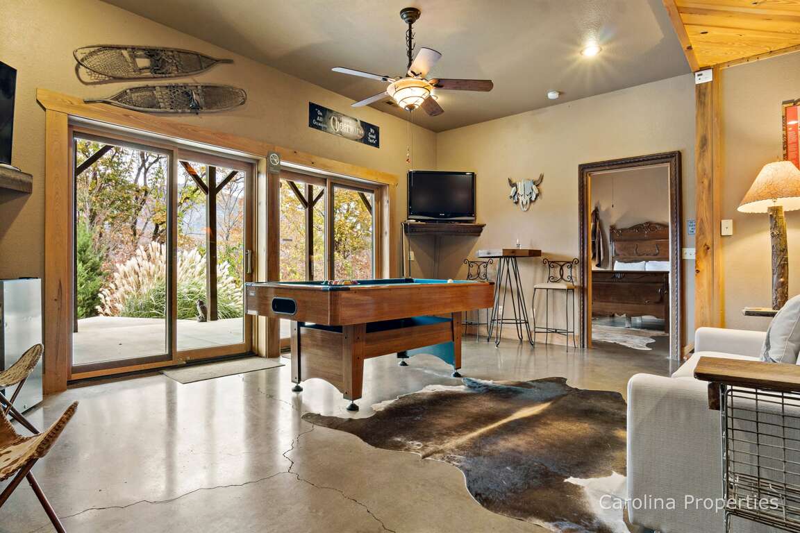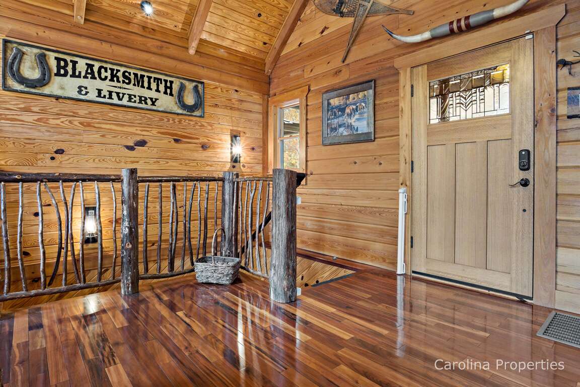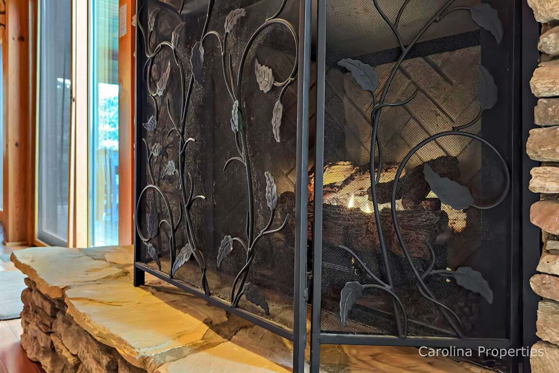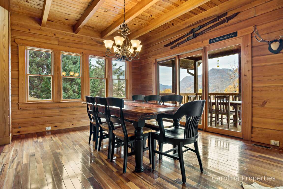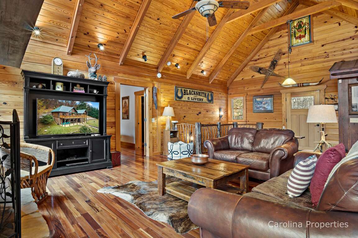 Symphony House is an incredibly beautiful log home with exceptional views of the Hickory Nut Gorge & Chimney Rock State Park in the heart of Lake Lure. It offers an open floor plan with soaring vaulted ceilings, a stone gas fireplace to enjoy during cooler weather seasons, Brazilian tiger hardwood floors, a massive granite kitchen island with seating to gather around, and custom cherry cabinets. The spacious master suite on the main level has a slate shower, two vanities, and a large walk-in closet. Sliding glass doors lead to the back deck, where you can grill and enjoy the view under the covered portion, which is perfect for entertaining. The lower features two oversized bedrooms, each with a full bathroom. Large recreation room with a pool table that leads to the concrete patio with even more room to enjoy the outdoors.