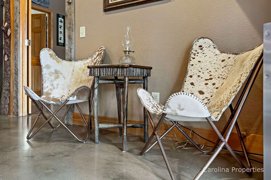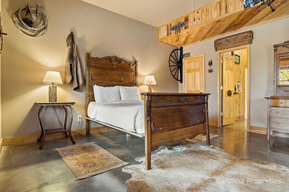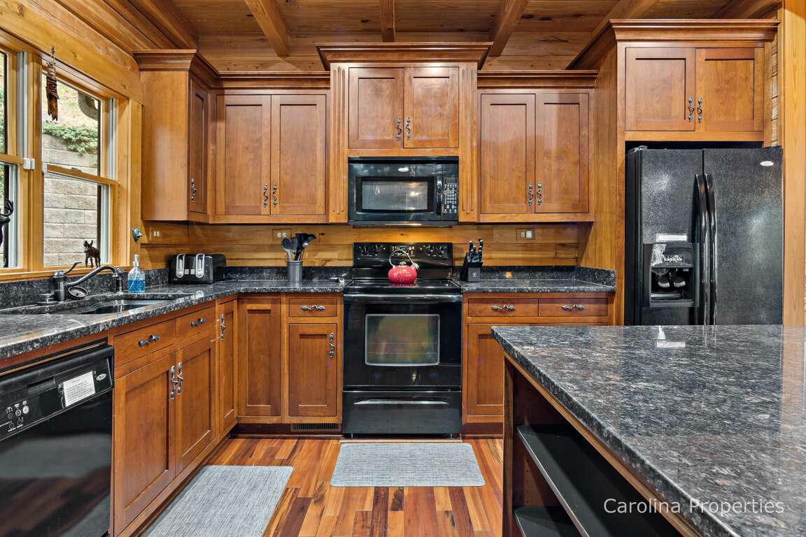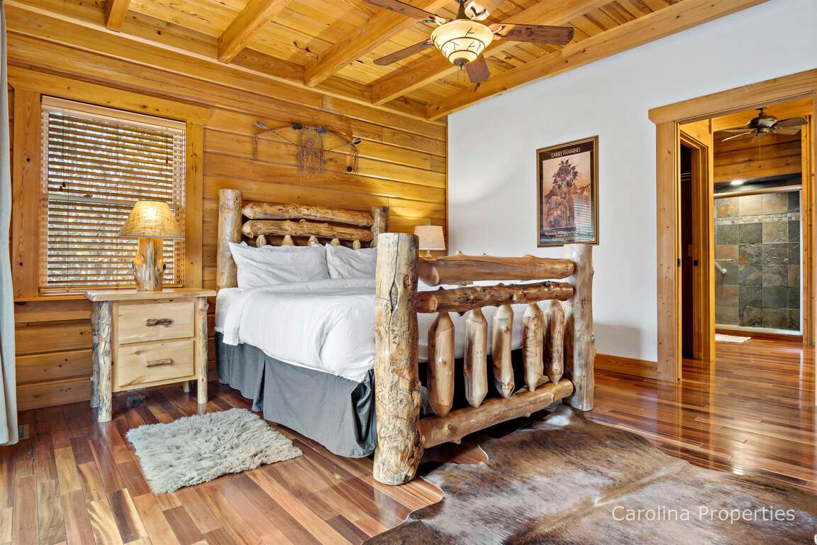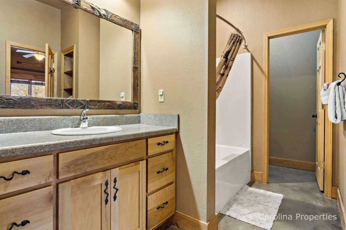 Symphony House is an incredibly beautiful log home with exceptional views of the Hickory Nut Gorge & Chimney Rock State Park in the heart of Lake Lure. It offers an open floor plan with soaring vaulted ceilings, a stone gas fireplace to enjoy during cooler weather seasons, Brazilian tiger hardwood floors, a massive granite kitchen island with seating to gather around, and custom cherry cabinets. The spacious master suite on the main level has a slate shower, two vanities, and a large walk-in closet. Sliding glass doors lead to the back deck, where you can grill and enjoy the view under the covered portion, which is perfect for entertaining. The lower features two oversized bedrooms, each with a full bathroom. Large recreation room with a pool table that leads to the concrete patio with even more room to enjoy the outdoors.