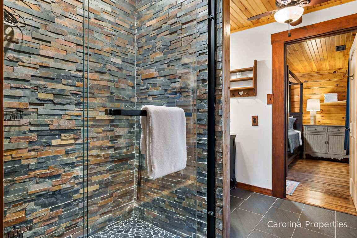 The Master Bedroom, with a King bed, 55-inch TV, and large walk-in closet, is just off the living room. A Jack-and-Jill bathroom with a walk-in tub and shower separates the Master Bedroom from the Guest Bedroom, with a large 4-poster Queen bed and a 55-inch TV.