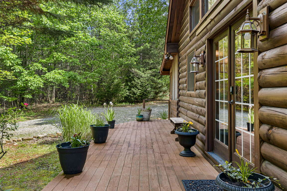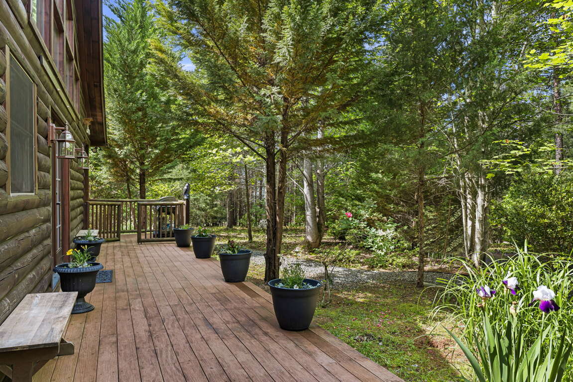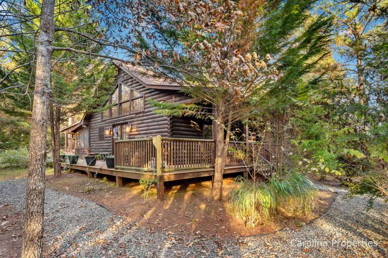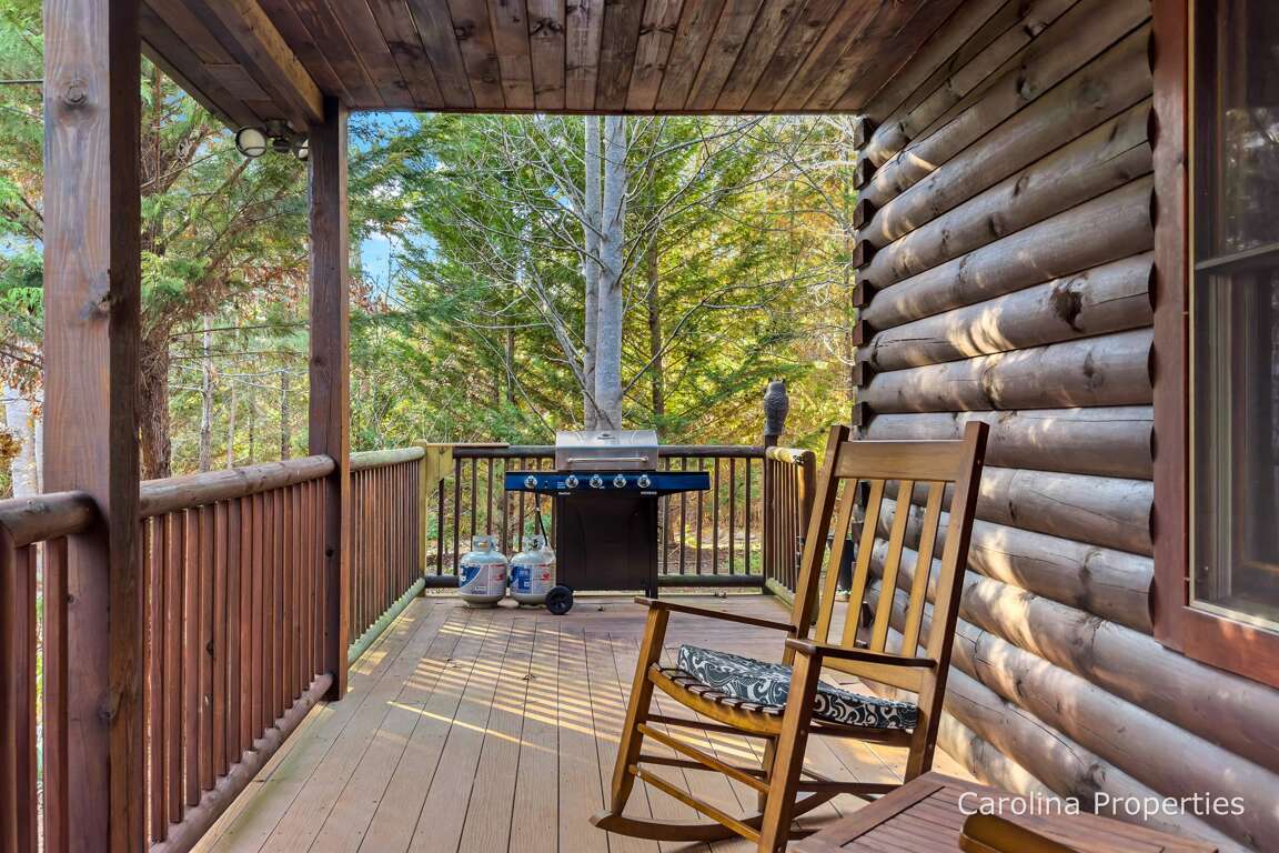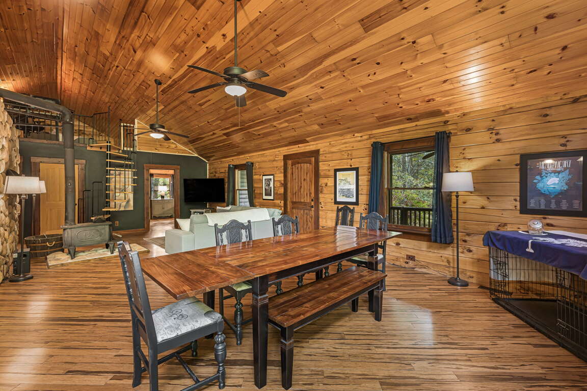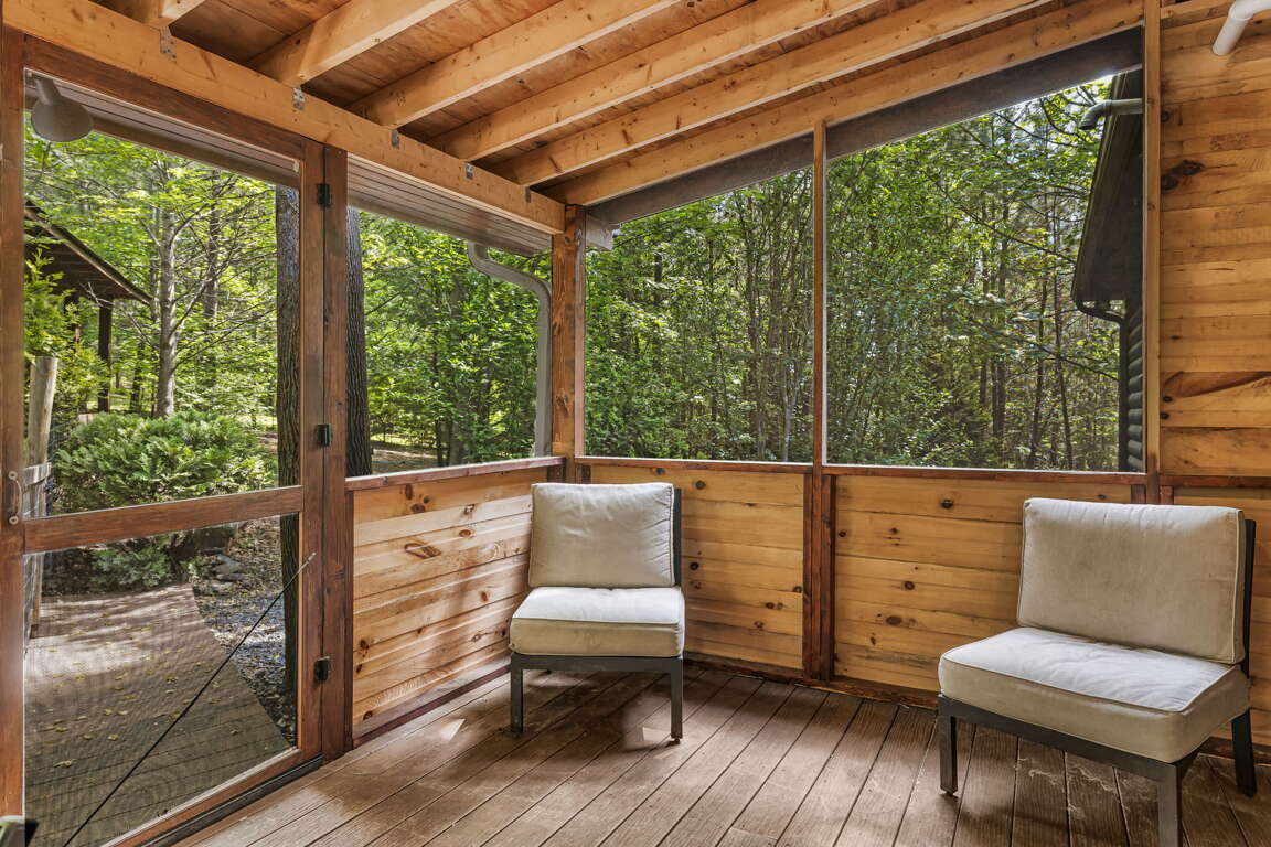 From the parking area, you'll enter the front of the cabin from the wrap-around deck, through French doors, into the well-appointed great room. The fully functional kitchen has everything you need to prepare your meals. There is ample seating in the dining area that adjoins the kitchen. Just off the dining area is the relaxing living room, complete with a 65" flat screen TV, an Xbox XS w/Game Pass, and a wood-burning stove for those extra chilly nights; firewood is provided. There is a large laundry room with a washer and dryer right off the kitchen, leading to a lovely screened porch perfect for your morning coffee or an after-dinner glass of wine. A gas grill sits just outside the screened porch for easy access to the kitchen. A lovely fire pit and outdoor sitting area complete the backyard.