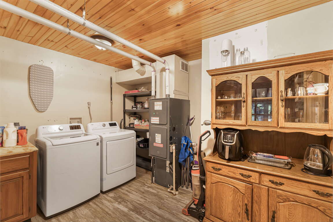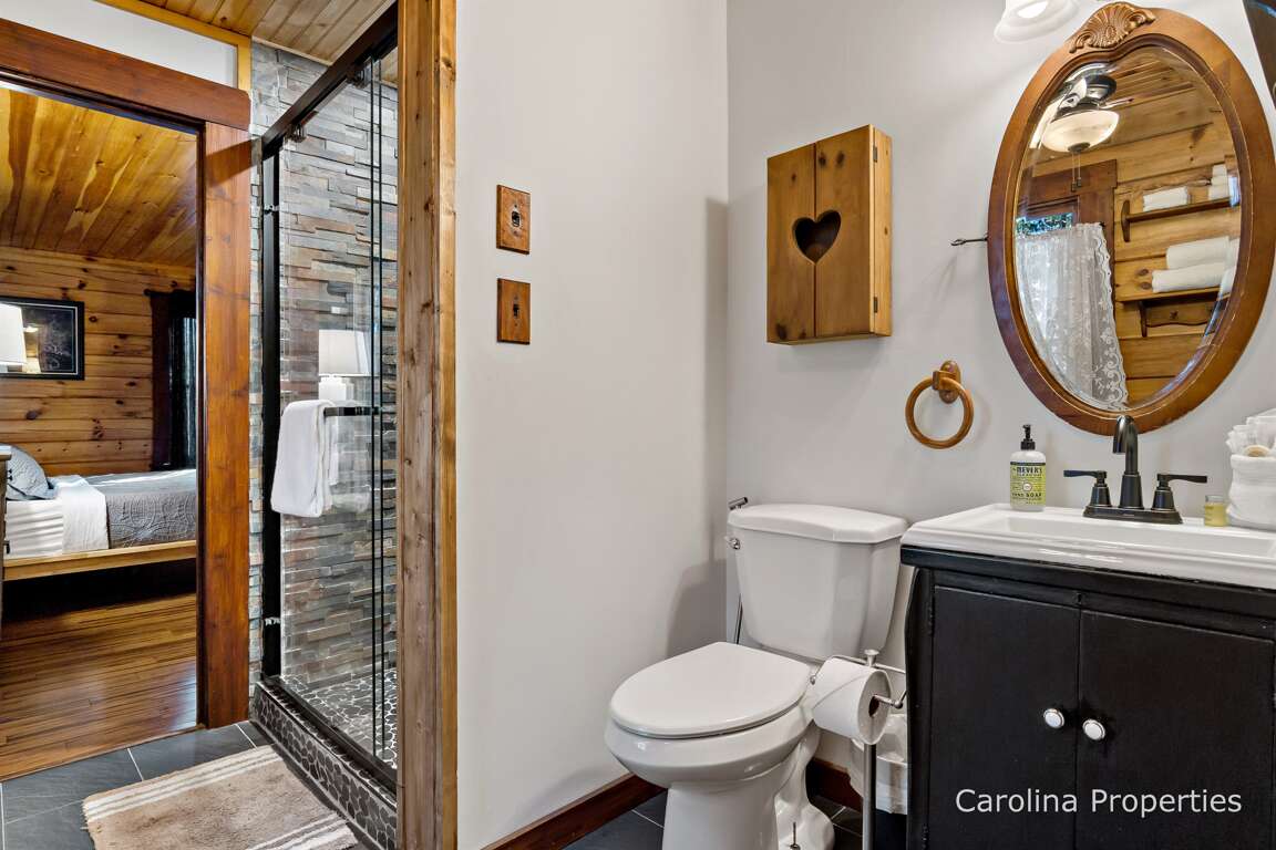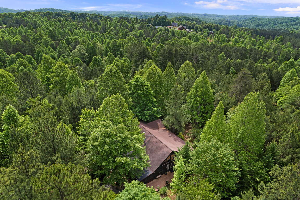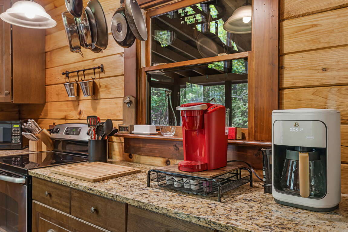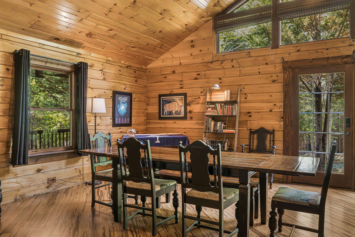 From the parking area, you'll enter the front of the cabin from the wrap-around deck, through French doors, into the well-appointed great room. The fully functional kitchen has everything you need to prepare your meals. There is ample seating in the dining area that adjoins the kitchen. Just off the dining area is the relaxing living room, complete with a 65" flat screen TV, an Xbox XS w/Game Pass, and a wood-burning stove for those extra chilly nights; firewood is provided. There is a large laundry room with a washer and dryer right off the kitchen, leading to a lovely screened porch perfect for your morning coffee or an after-dinner glass of wine. A gas grill sits just outside the screened porch for easy access to the kitchen. A lovely fire pit and outdoor sitting area complete the backyard.