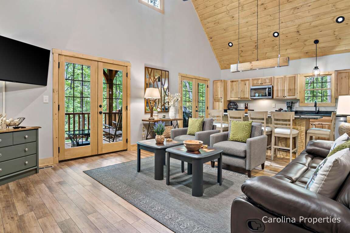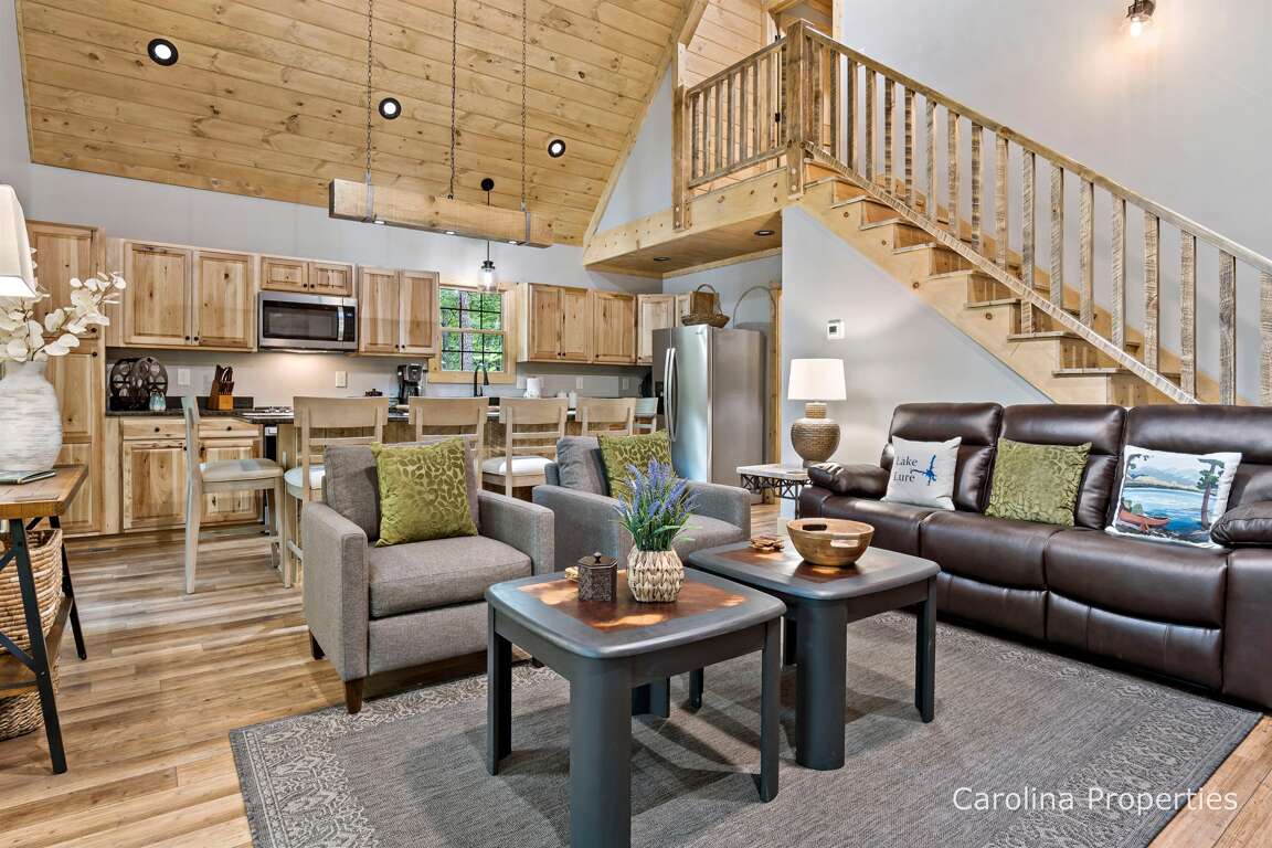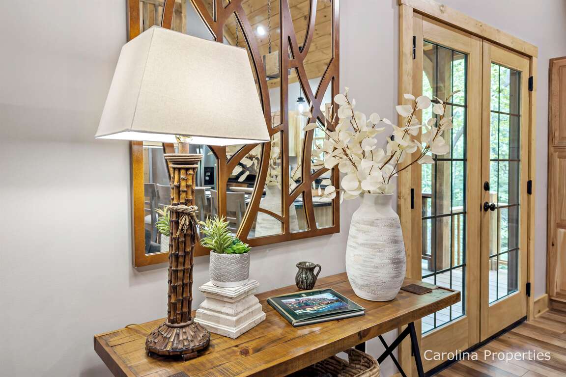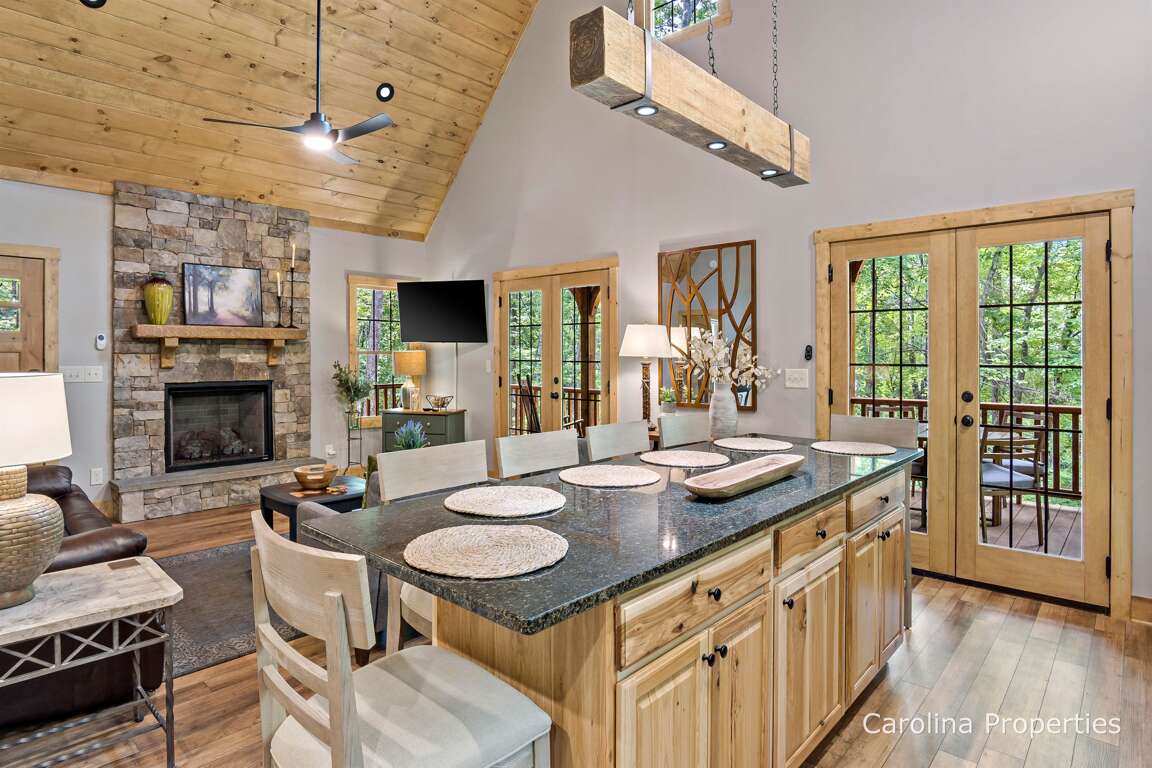 This delightful rustic-chic cabin is perfectly placed right across from Lake Lure Beach and Marina, just minutes from the downtown area of Chimney Rock Village and Chimney Rock State Park. It features a large gravel driveway offering easy parking.
