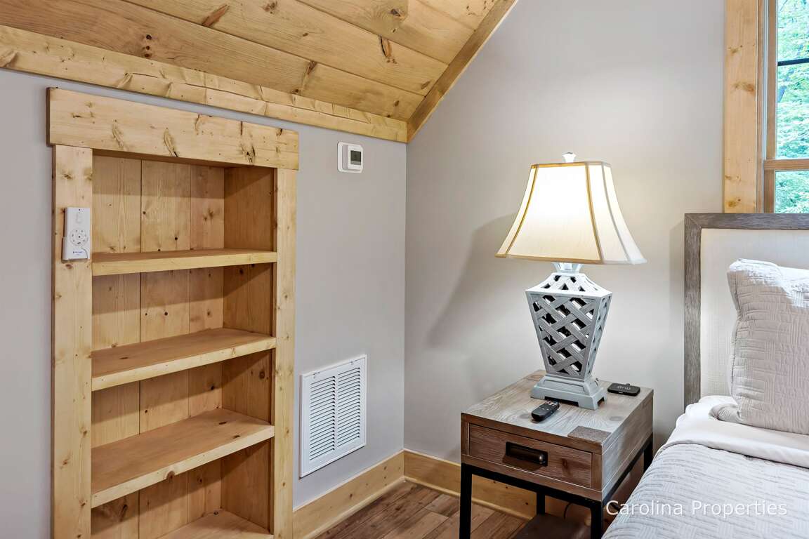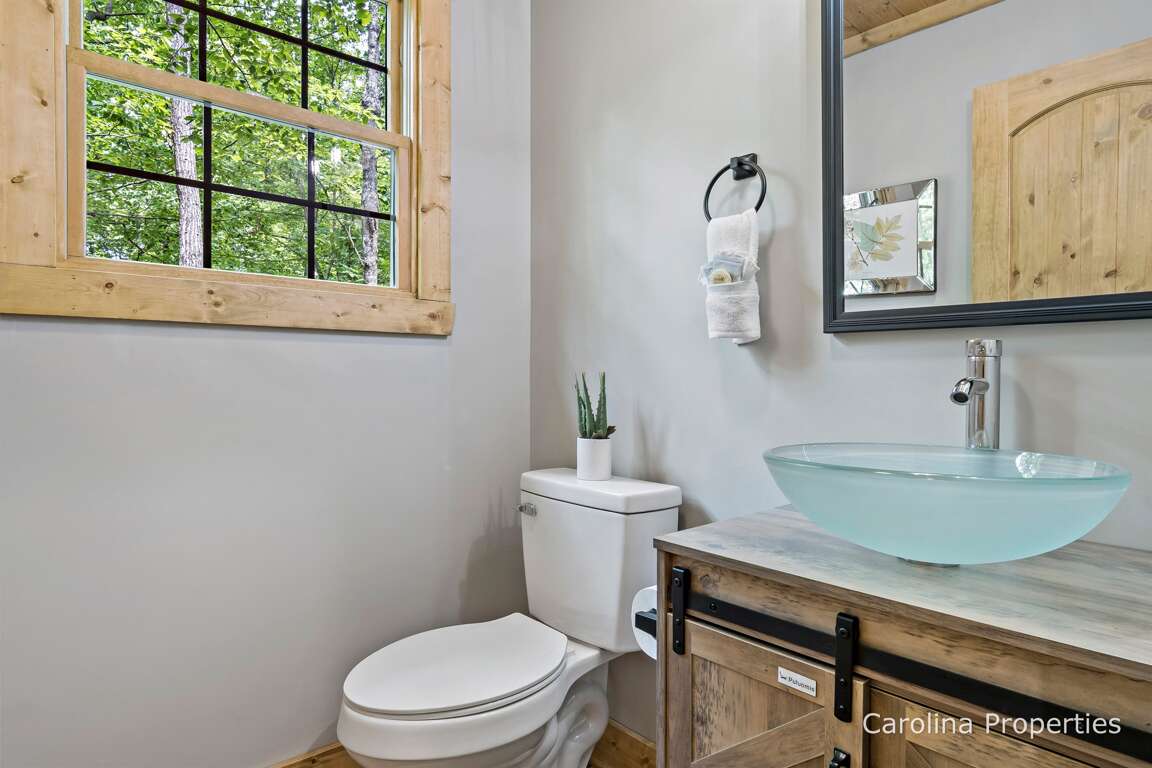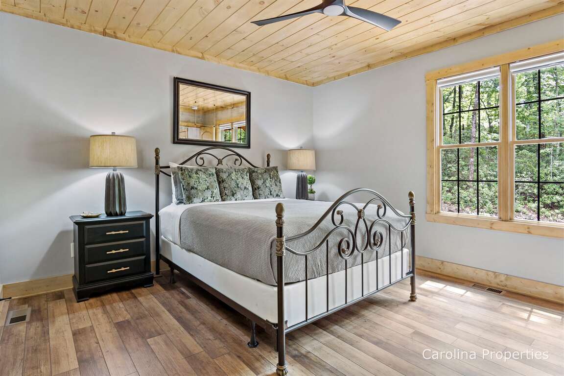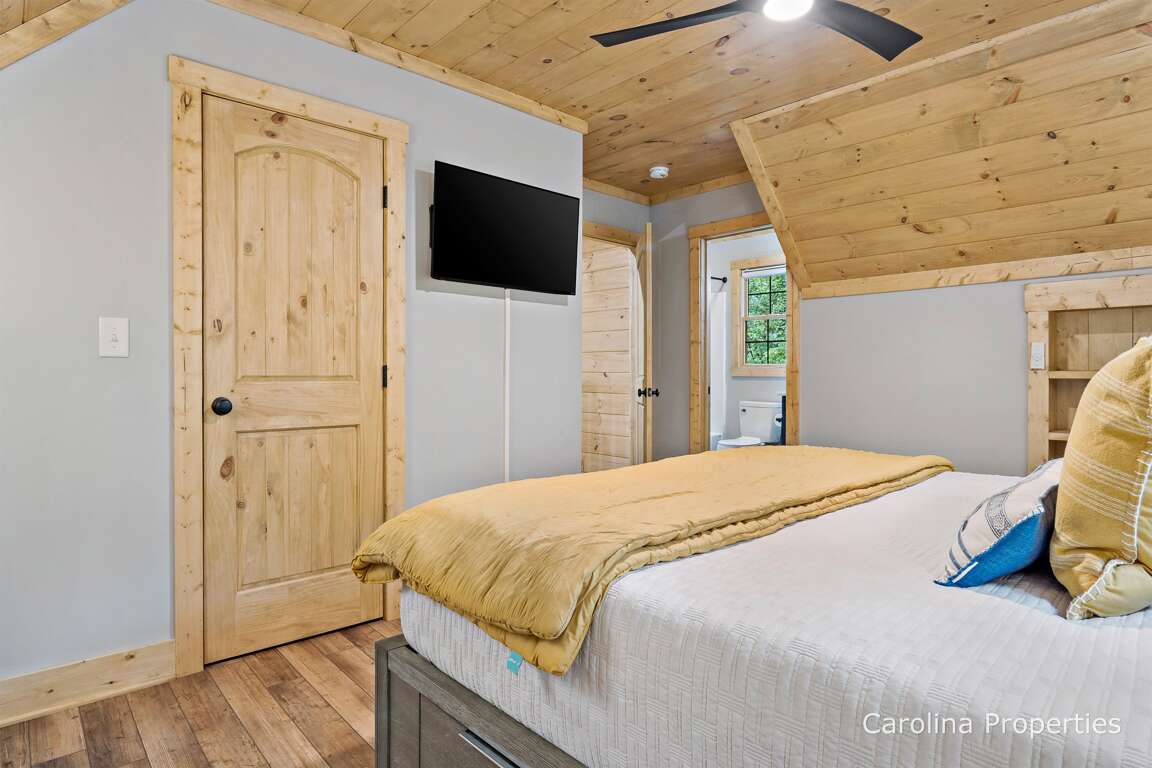 Moving upstairs, the cabin boasts a king bedroom surrounded by peaceful forest views. This bedroom also features a bathroom and a charming bathtub for relaxing moments.