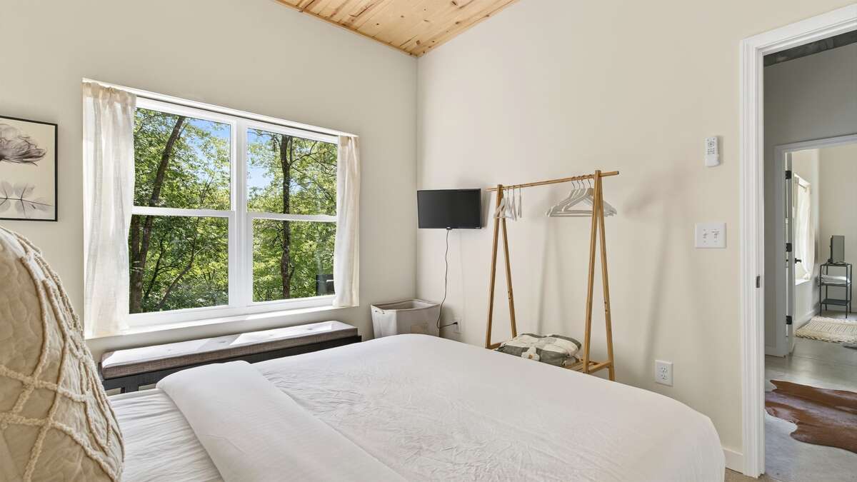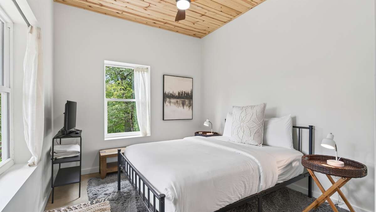 Main Level Master Bedroom: Drift off to sleep in the queen-sized bed, catch up on your favorite shows on the TV, and enjoy the convenience of an en-suite full bathroom with a shower.