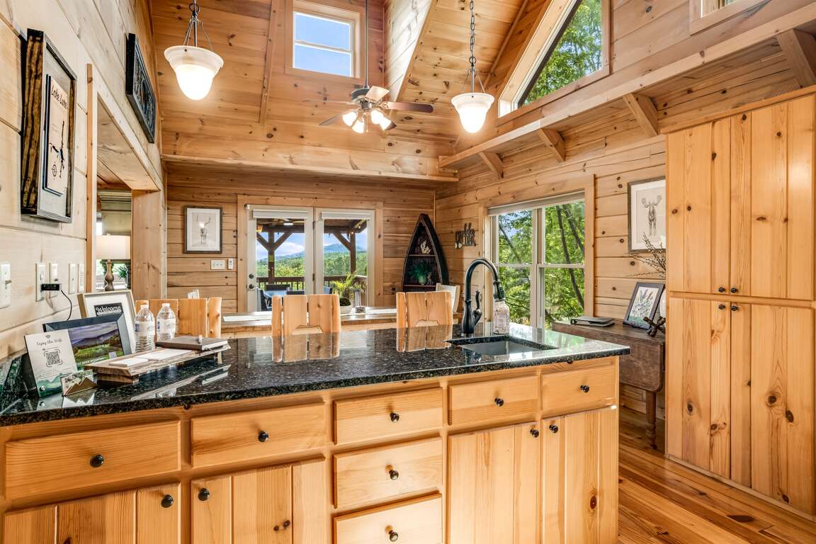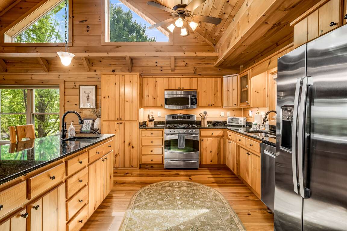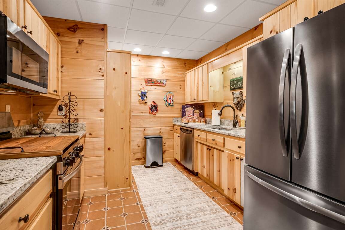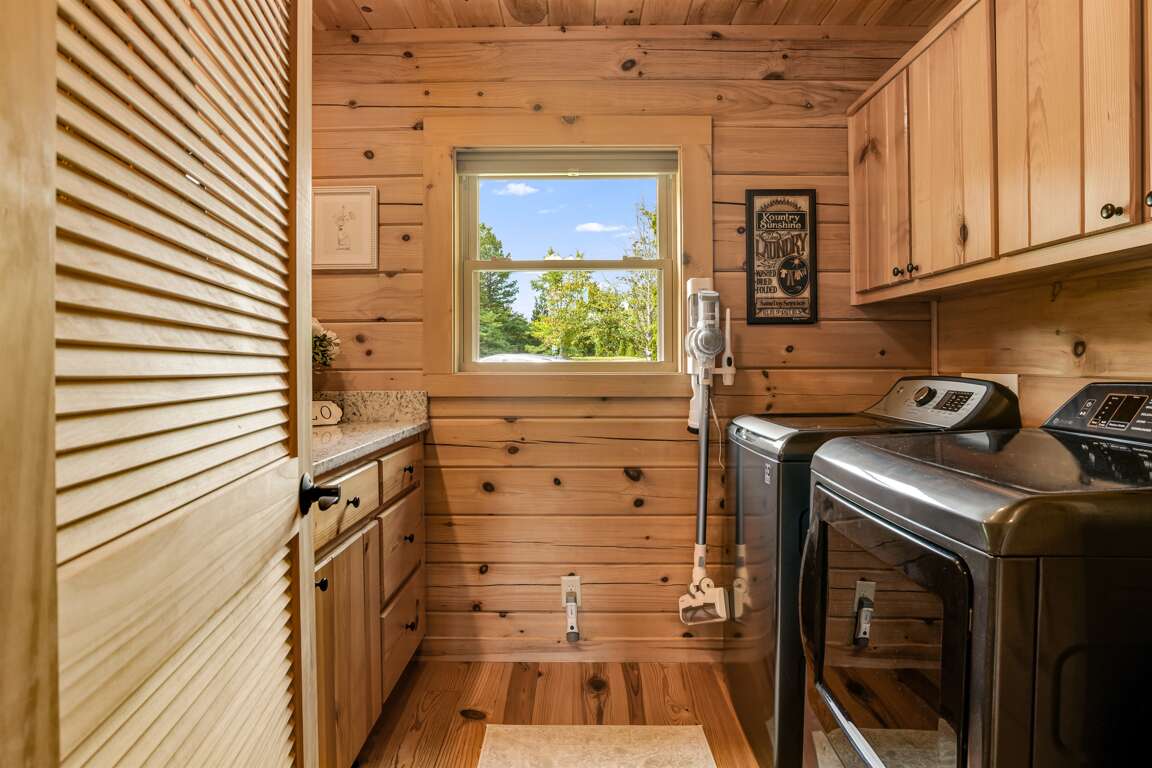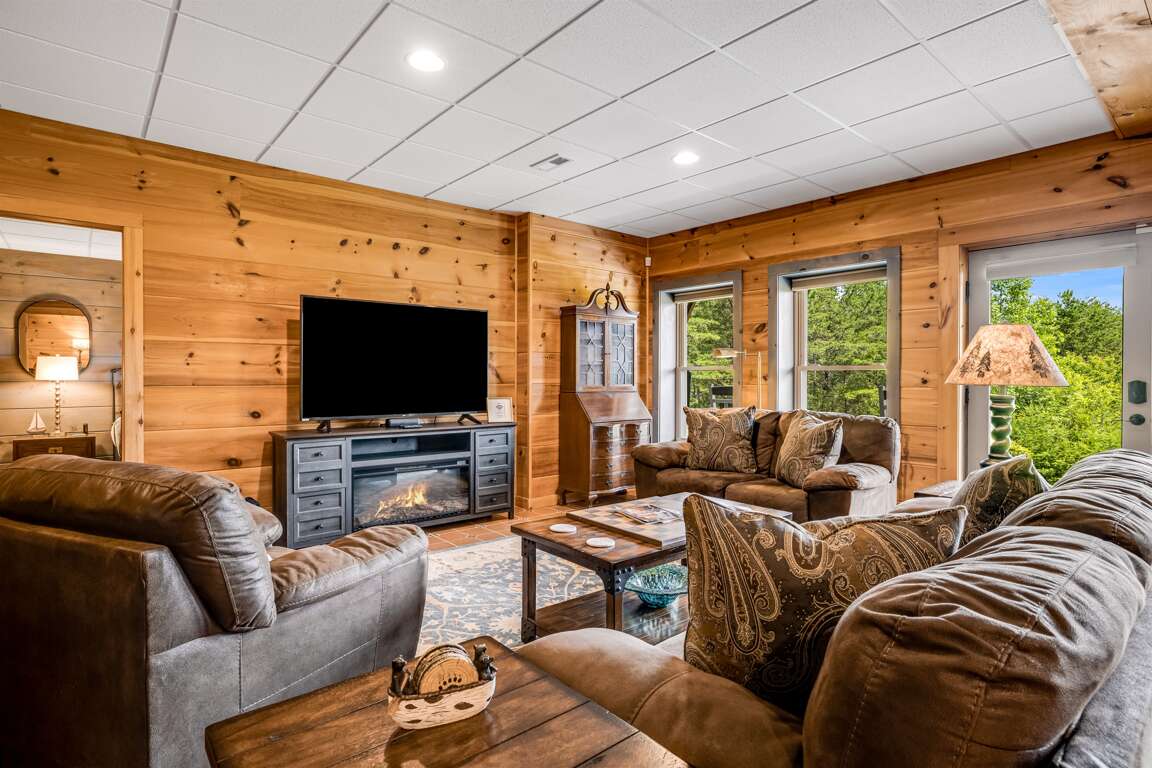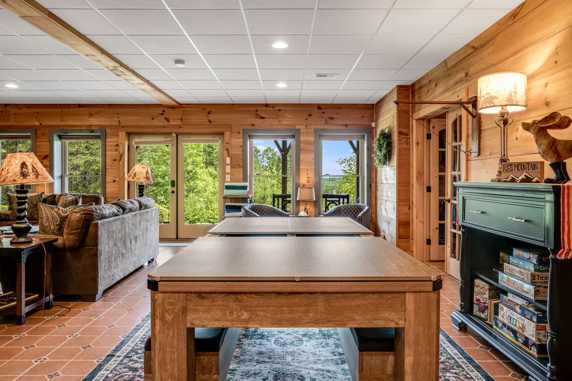 The fully finished lower level is made for entertainment, with a second living area, large TV, vintage arcade games, board games, and a pool table that converts to ping pong or a game/puzzle table. Two queen bedrooms—each with its own TV—offer cozy accommodations, one of which has direct access to a full bathroom with a walk-in shower. The second full kitchen and additional laundry set make it ideal for multiple families or extended stays.