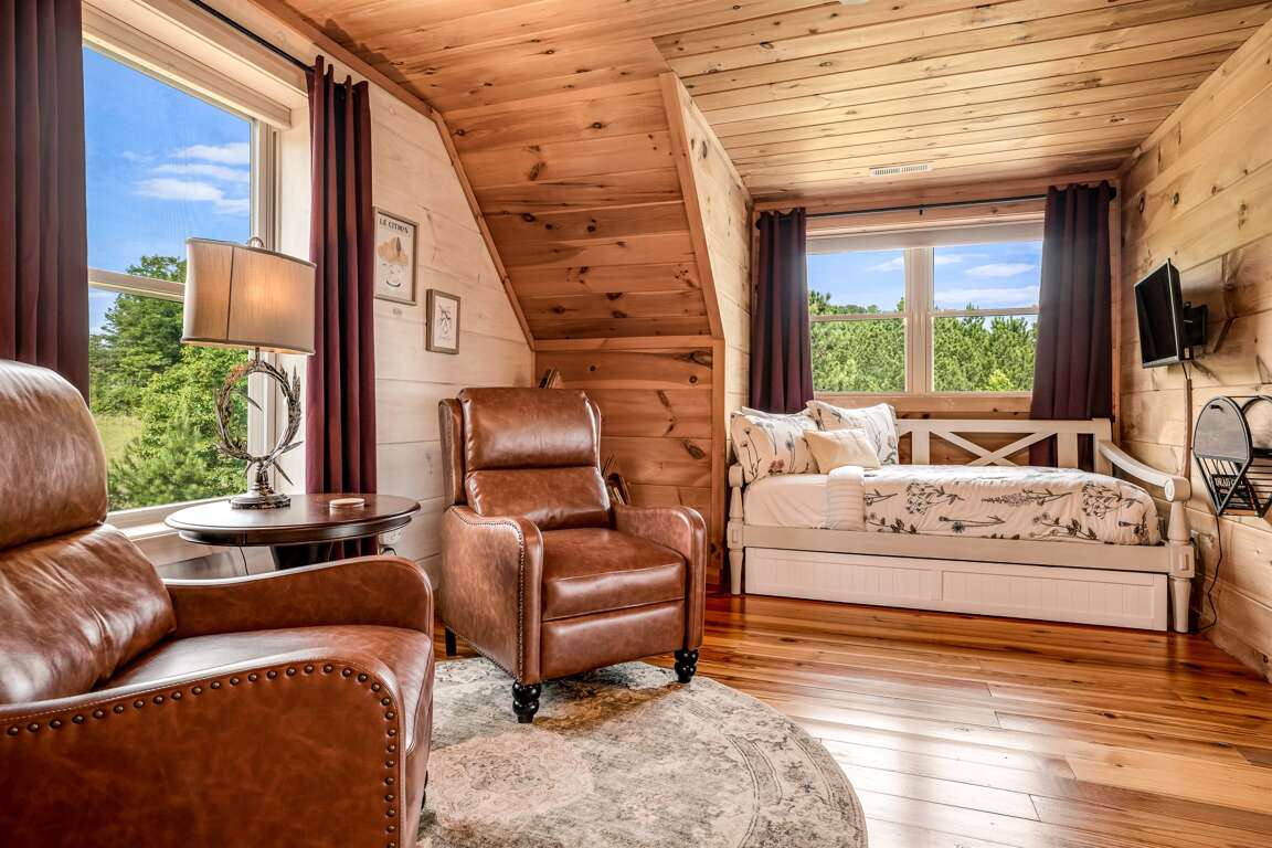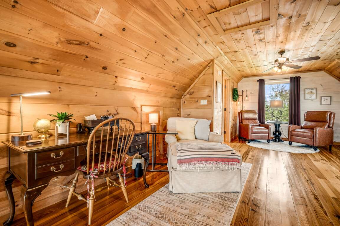 Upstairs, the versatile loft features a twin daybed with trundle, desk, chaise lounge, TV, and privacy curtains—plus its own en suite bathroom with a bathtub. It’s the perfect hideaway for kids or solo travelers seeking a workspace or to read, relax, and be calm.