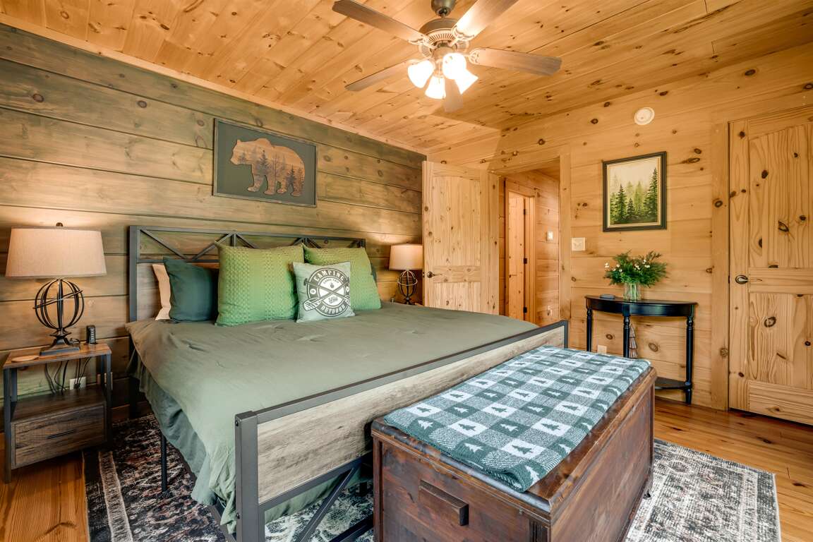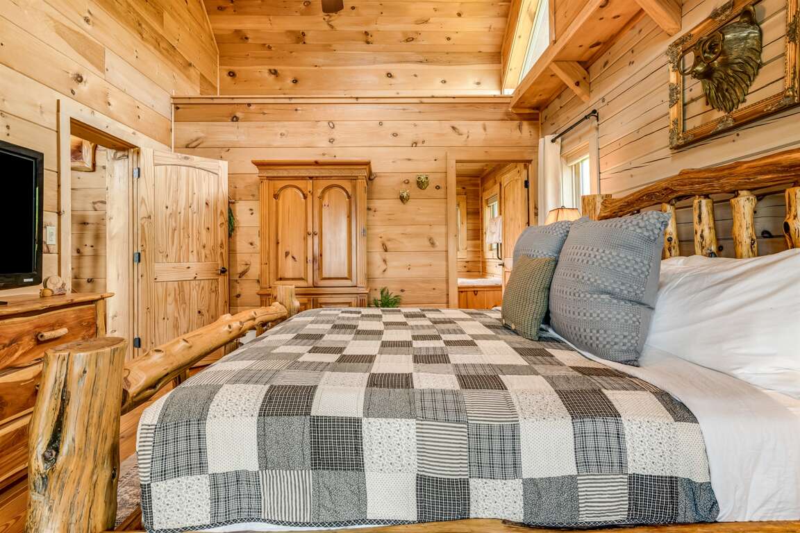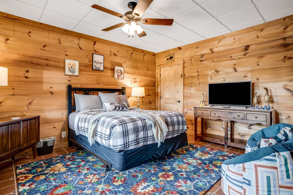 The living room is anchored by a grand stone fireplace(not operational June through August) and oversized TV, offering the ultimate space to cozy up after a day of adventure. The main-level primary suite is a serene retreat with a king-size bed, soaring windows, a large TV, and direct access to the patio. Its en suite bathroom evokes a spa, complete with a Jacuzzi tub, walk-in shower, and dual vanities.