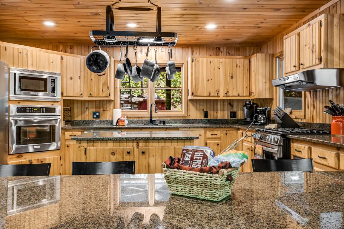 As you step inside, you’ll be welcomed by an open-concept kitchen and living area. To your right is the entrance to the fully finished basement, while straight ahead leads you into the heart of the home. The kitchen comes fully stocked with stainless steel appliances, including two ovens, perfect for preparing meals with ease. The spacious living room features a large sectional sofa, a big-screen TV, and access to the back deck, where a gas grill awaits for evening barbecues.