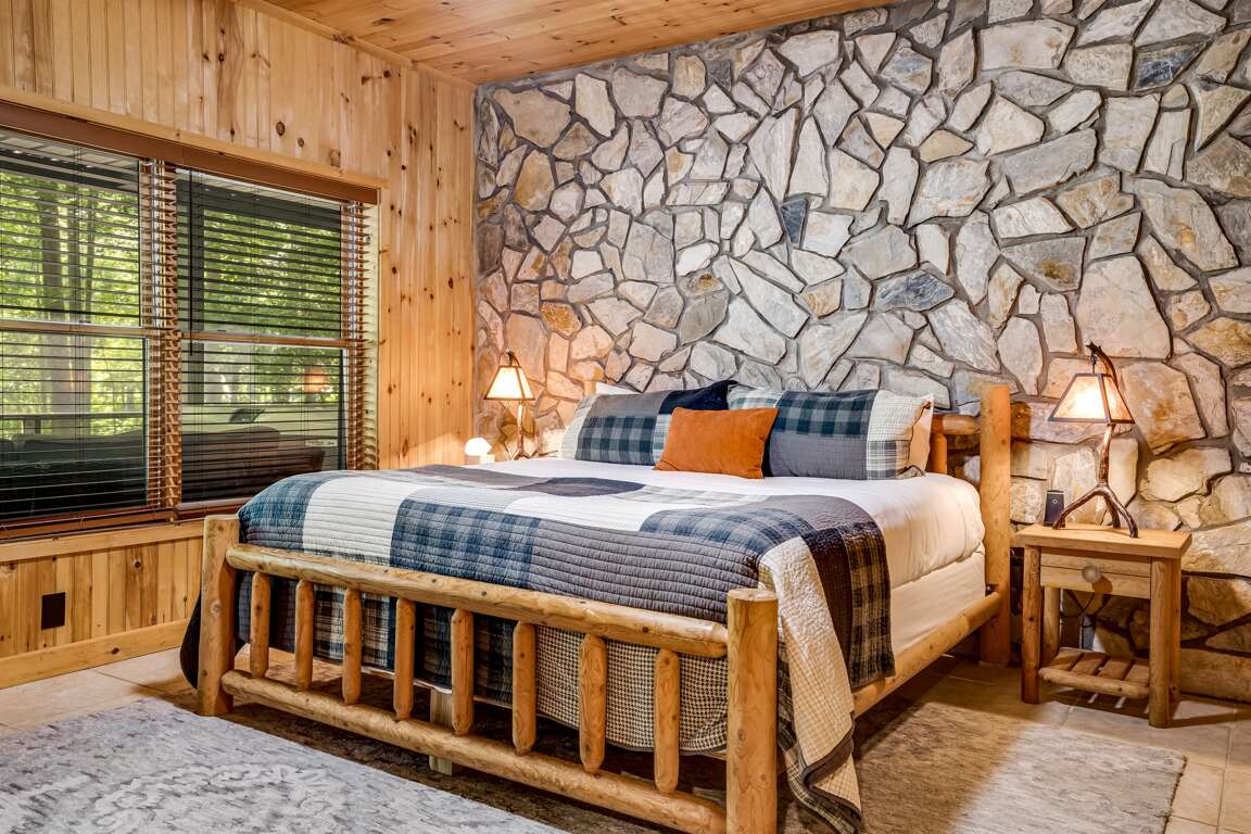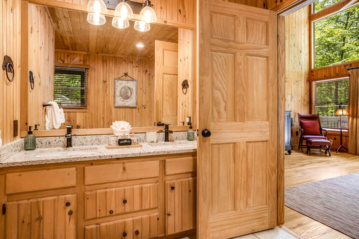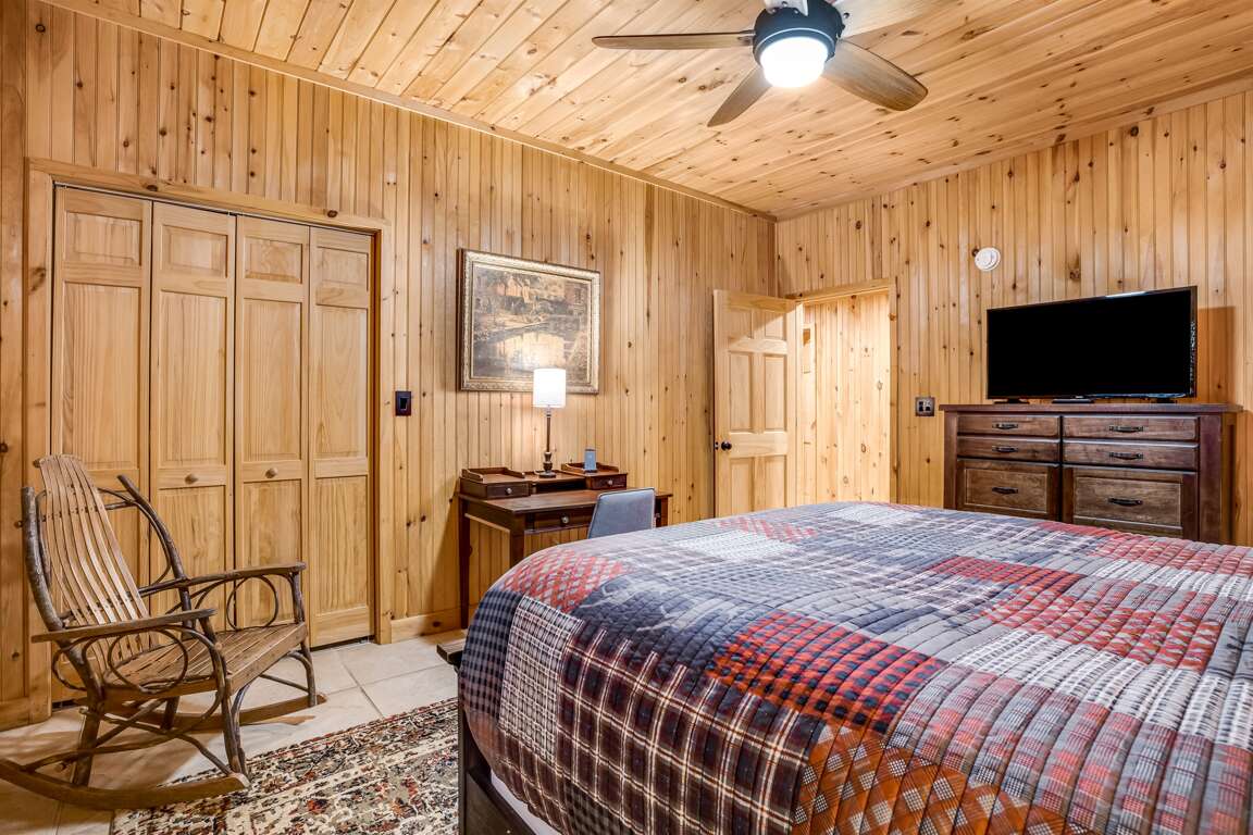On the main level, the primary bedroom offers a serene retreat with a king-size bed, a TV, and private access to the back deck. The en suite bathroom is spa-like, featuring a Jacuzzi tub, a large walk-in shower, and dual vanities for added convenience.