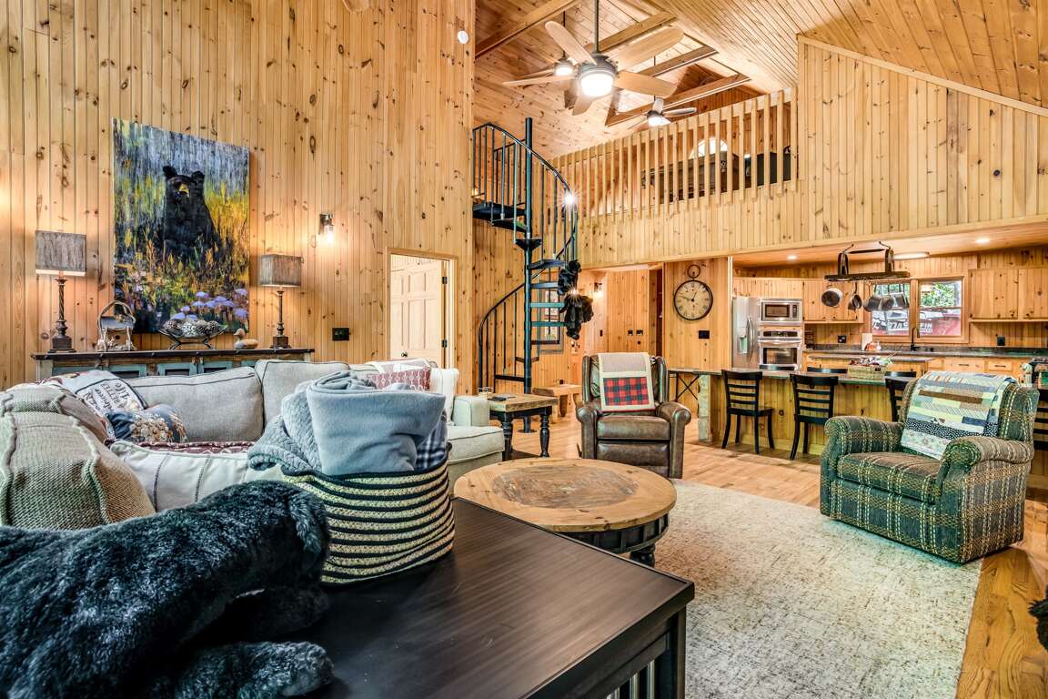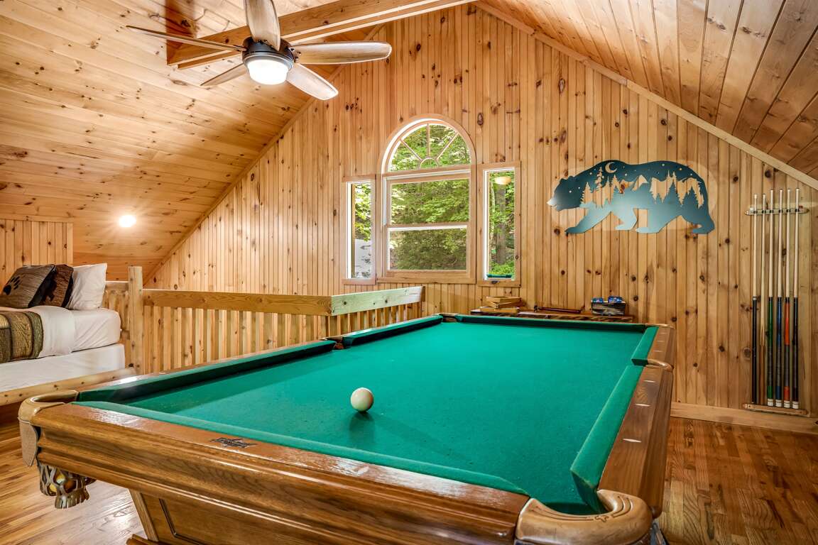 A spiral staircase leads to the loft, where you’ll find two twin beds and a pool table, making it a fun and comfortable spot to hang out.