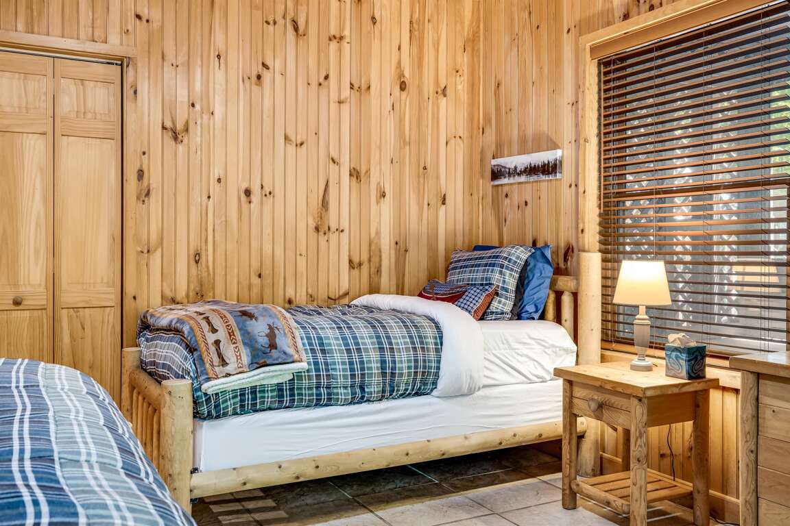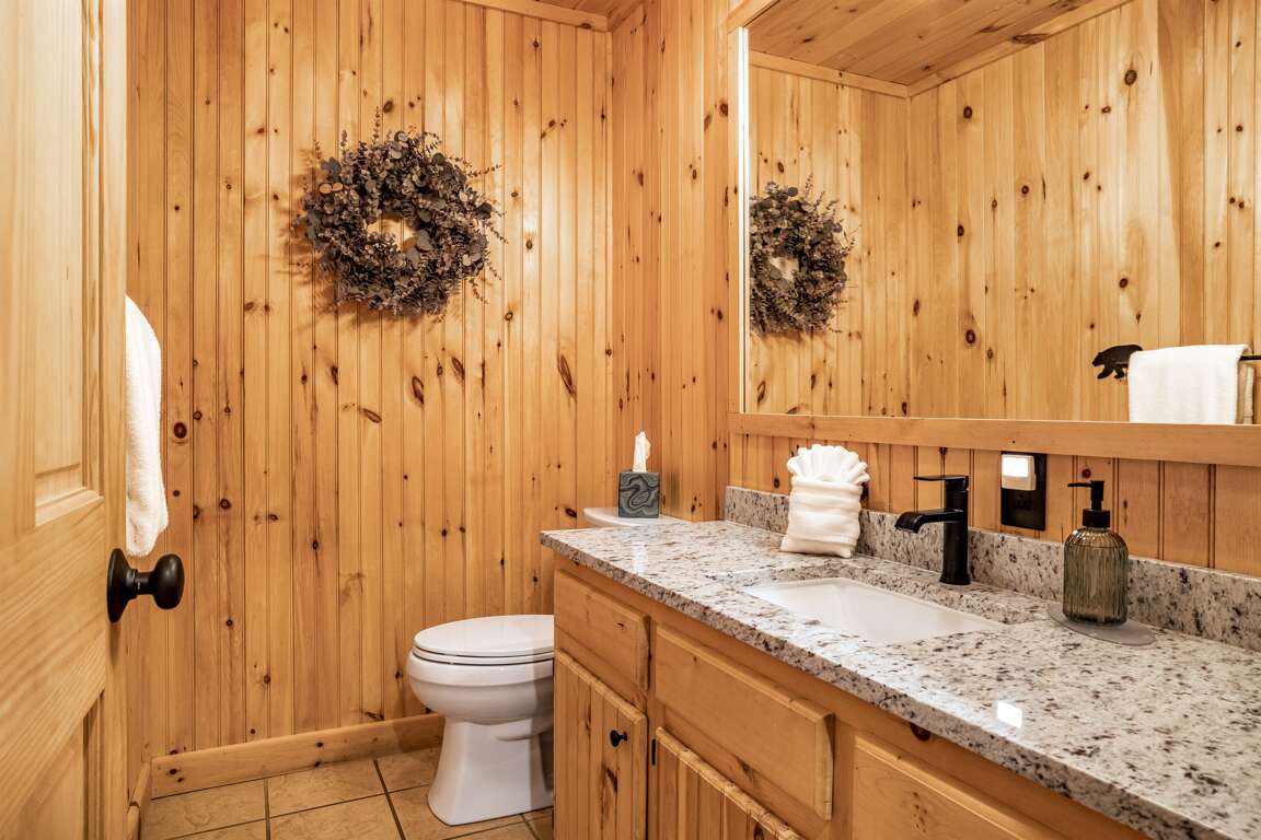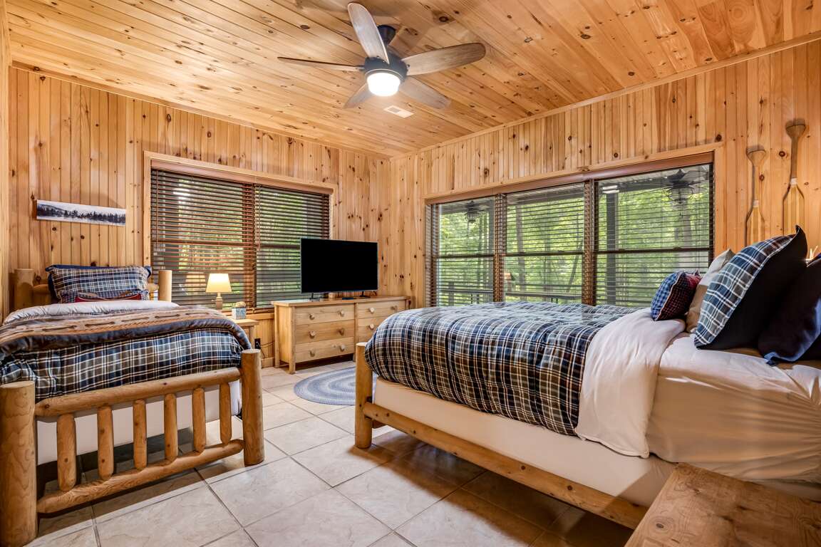 The lower level is fully furnished and expands the home’s living space. To the left, there’s a full bathroom with a walk-in shower, and around the corner, a laundry room with a full-size washer and dryer. The hallway leads to three additional bedrooms. The first is a cozy room with a queen-size bed and a TV. Further along, the second primary suite includes a king-size bed, a twin bed, a TV, and its en suite bathroom with a walk-in shower and dual sinks. The third bedroom on this level offers a queen-size bed, a twin bed, and a TV, making it a versatile space for families or groups.