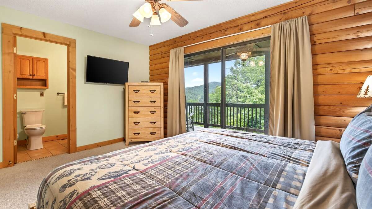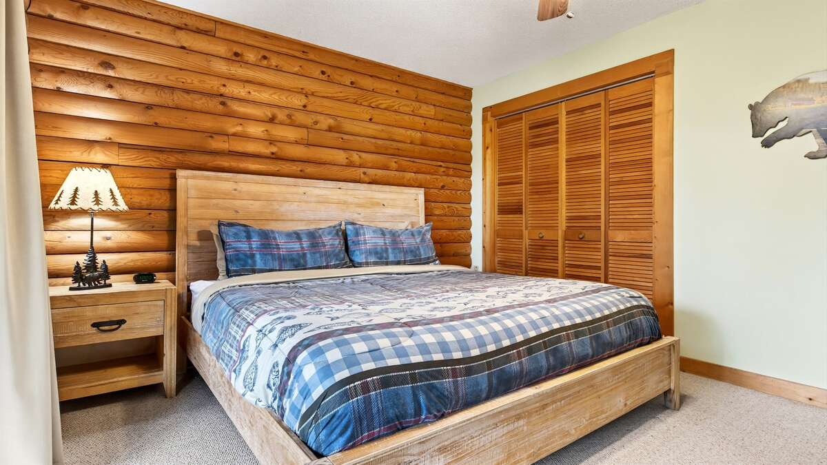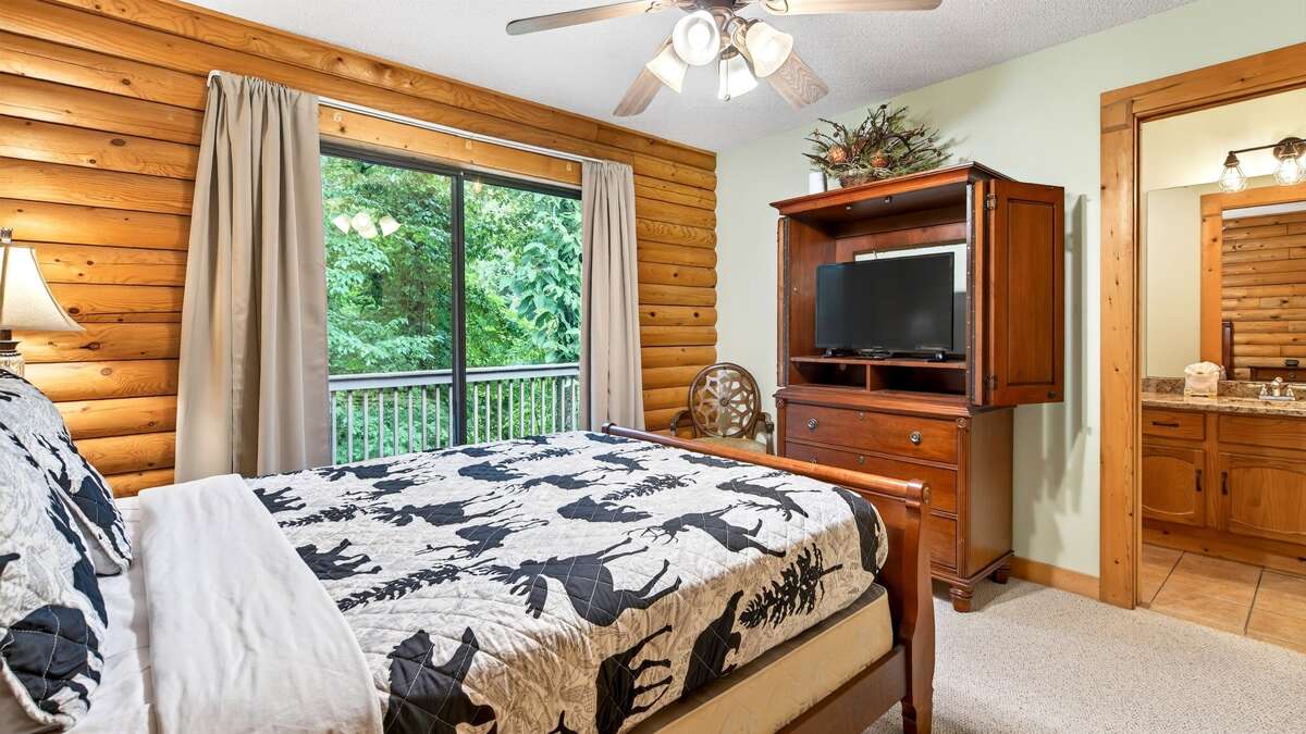 On the main level, the spacious primary bedroom features a TV, an en suite bathroom with a tub and shower combination, and private deck access through sliding glass doors. Across the hall, a cozy queen guest bedroom with a TV also offers direct access to the deck, making it easy to enjoy your morning coffee with a view. A full bathroom with a walk-in shower is also located on the main level.