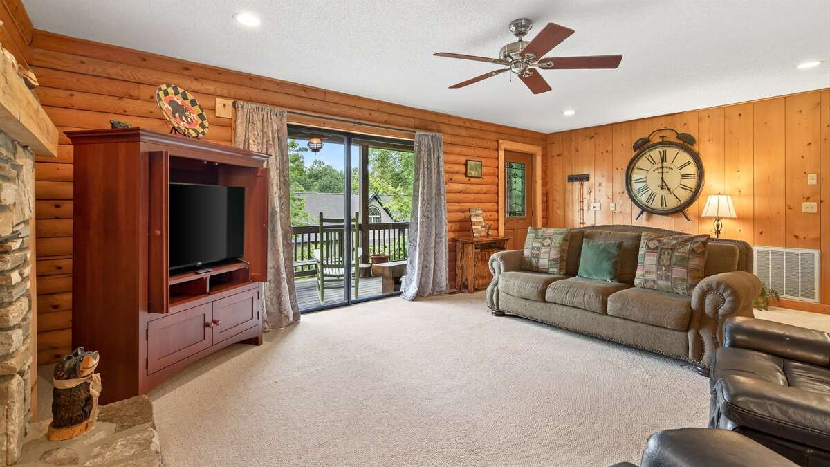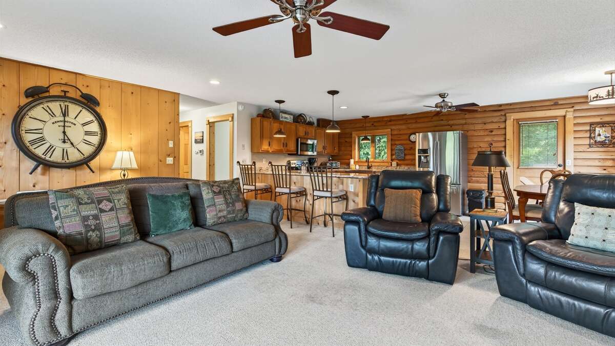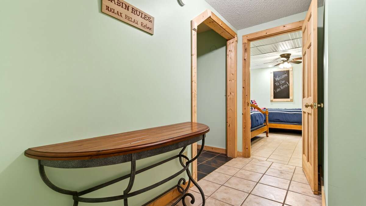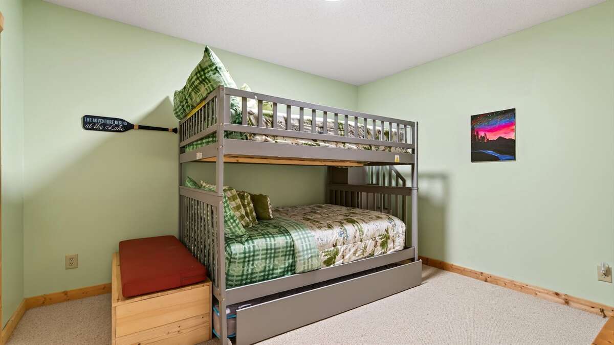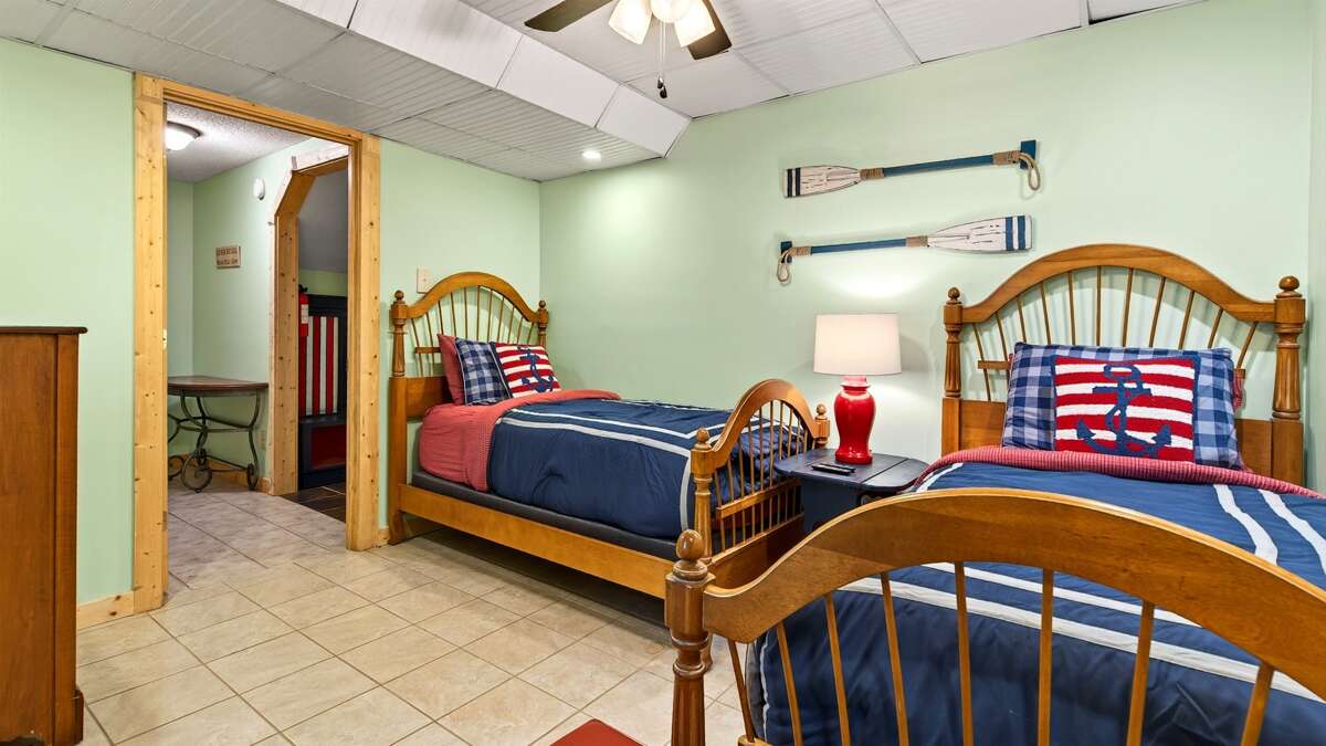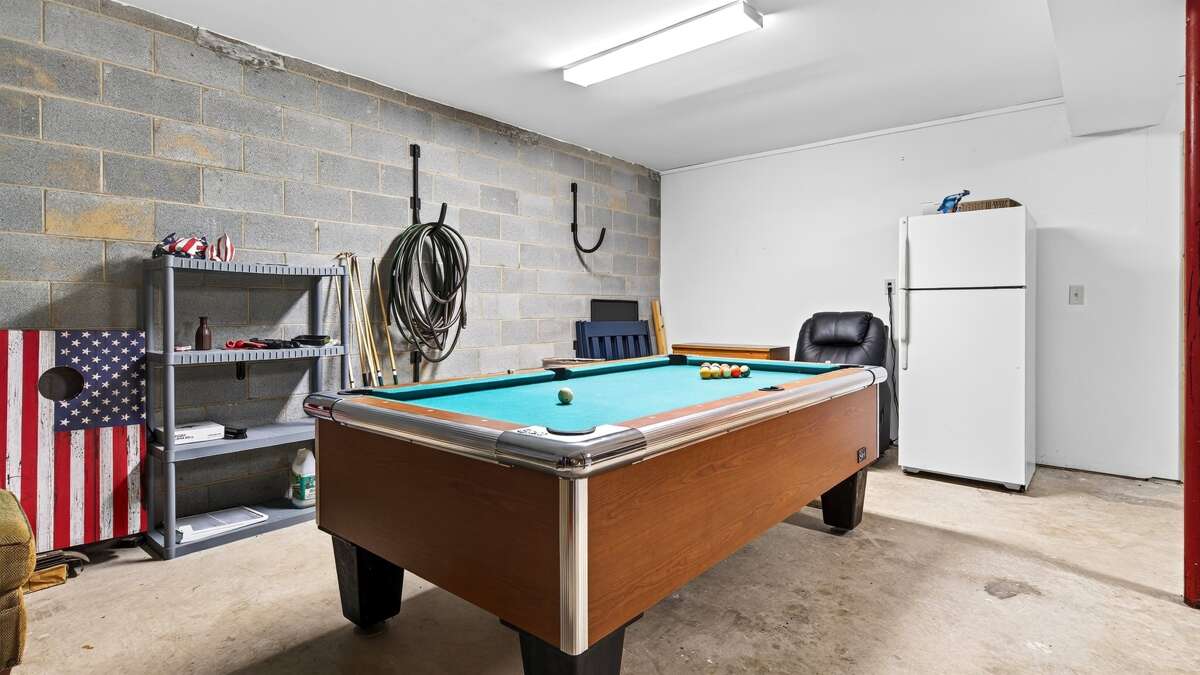 Downstairs, you’ll find a fun and functional space perfect for families or groups. A queen-size bunk bed room and a twin bedroom—each with a TV—share a jack-and-jill bathroom with a shower and combined laundry area. The lower level also includes garage access, where you’ll find a pool table and an extra refrigerator, along with parking space for one car.