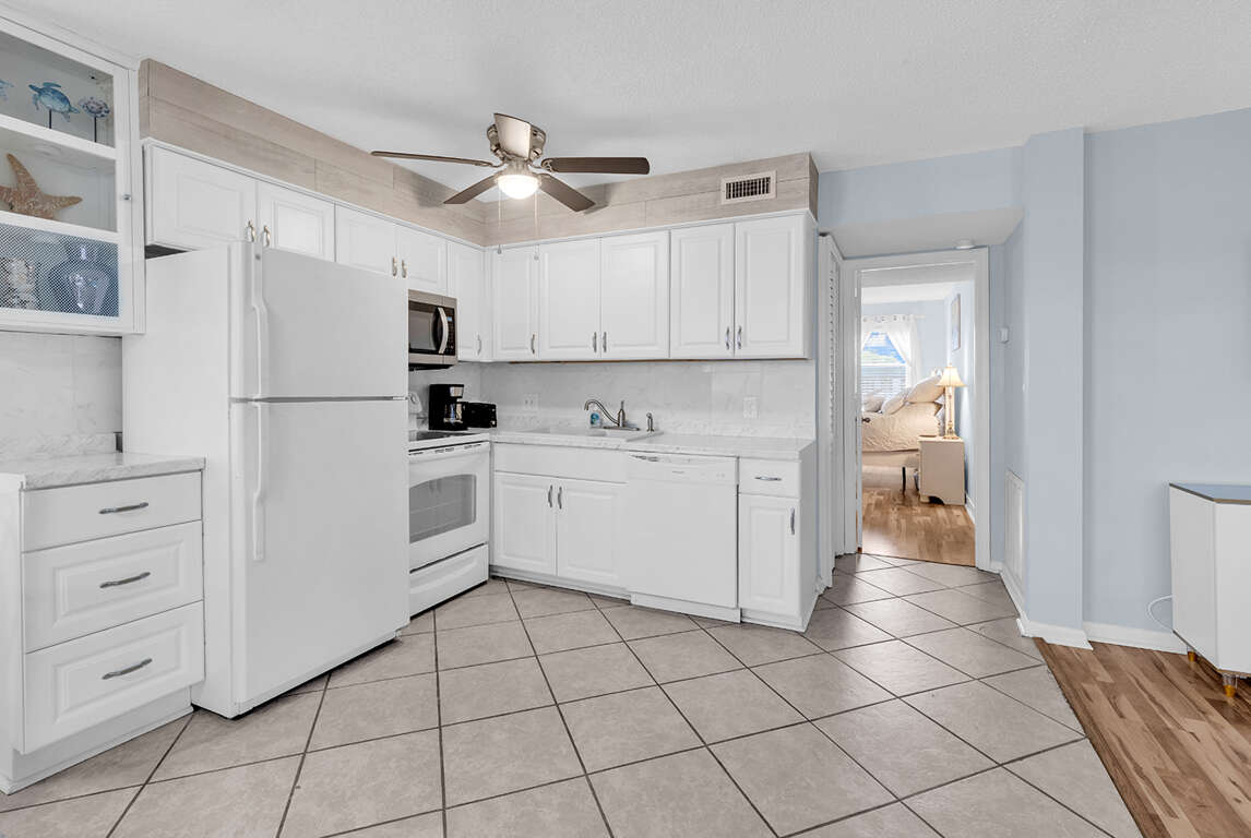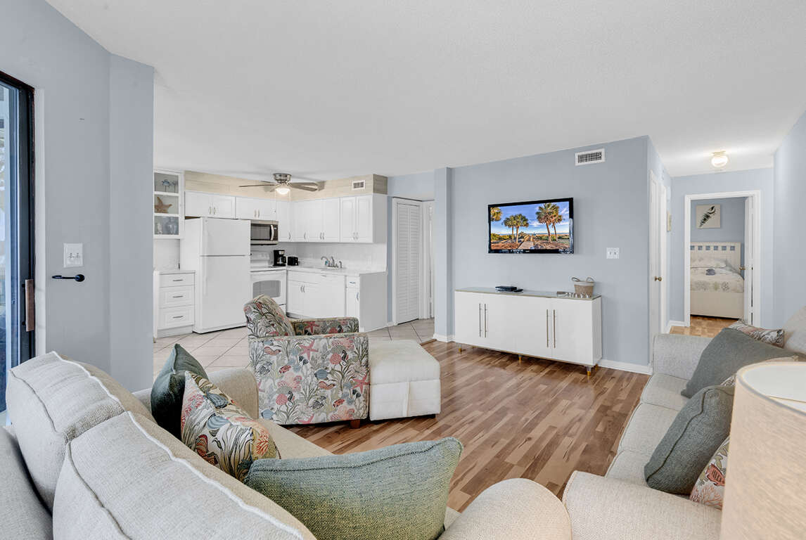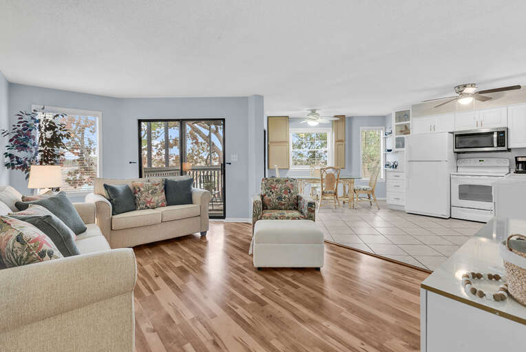 Updated Interior: Enjoy a bright, open-concept living space featuring modern LVP (Luxury Vinyl Plank) flooring and an updated kitchen with solid surface countertops—perfect for easy vacation meals.