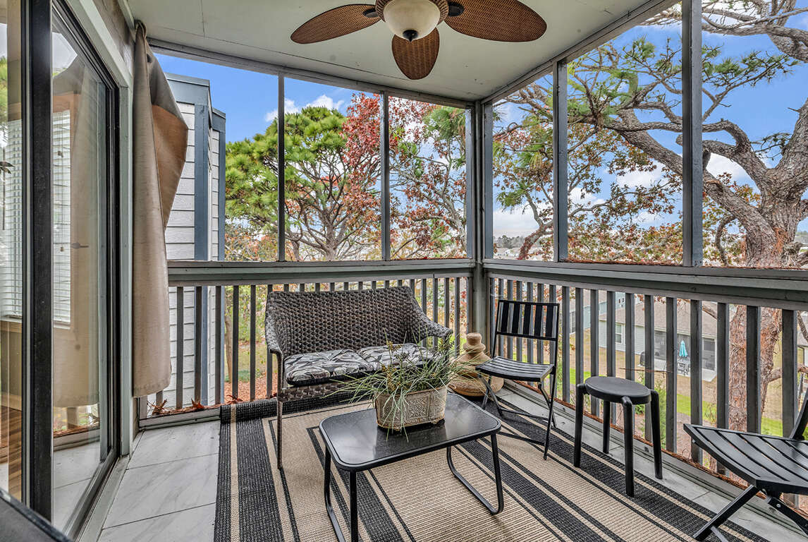 Private Screened Porch: Start your mornings with coffee or end your evenings relaxing on your private, screened-in porch overlooking the beautiful, mature trees and the quiet Possum Trot Golf Course area.