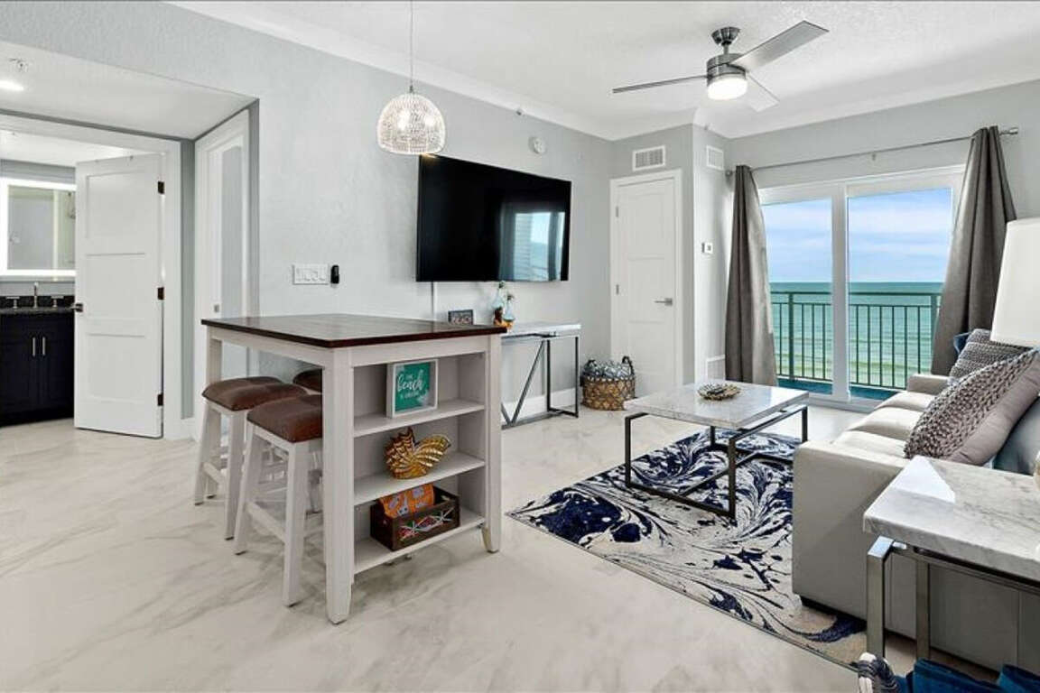 Bring the taste of New Smyrna indoors. The fully stocked kitchen includes stainless steel appliances, a breakfast bar, and all you need for in-condo meals or a quick beach snack prep.<br />