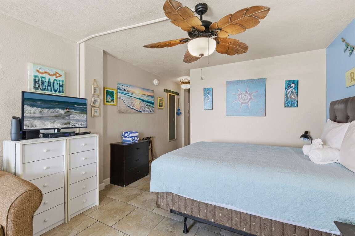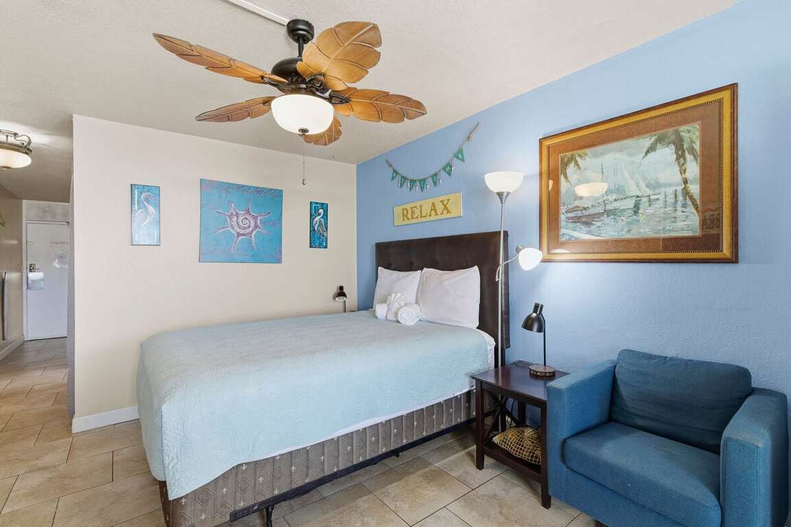 This bright studio features cheerful nautical décor and a thoughtful layout that feels open yet cozy. A queen bed offers restful sleep, while a twin-size sleeper sofa accommodates one more guest comfortably.