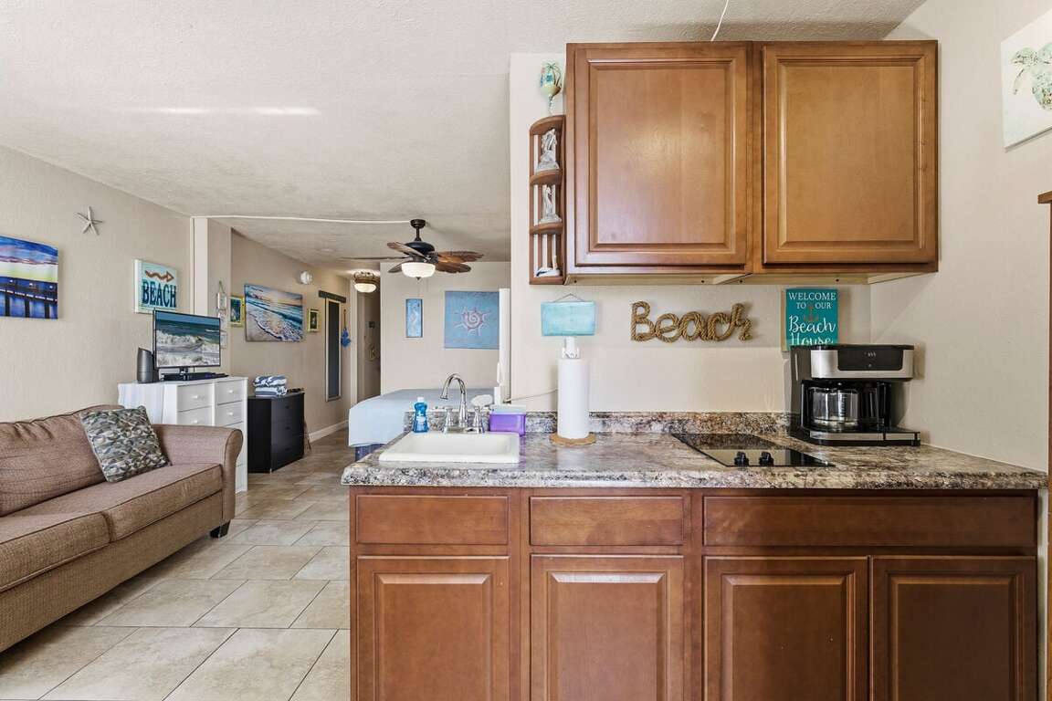 While compact, the kitchenette makes beach living easy. You’ll have all the basics to prep meals, snacks, or quick breakfasts before heading out for a day of fun.