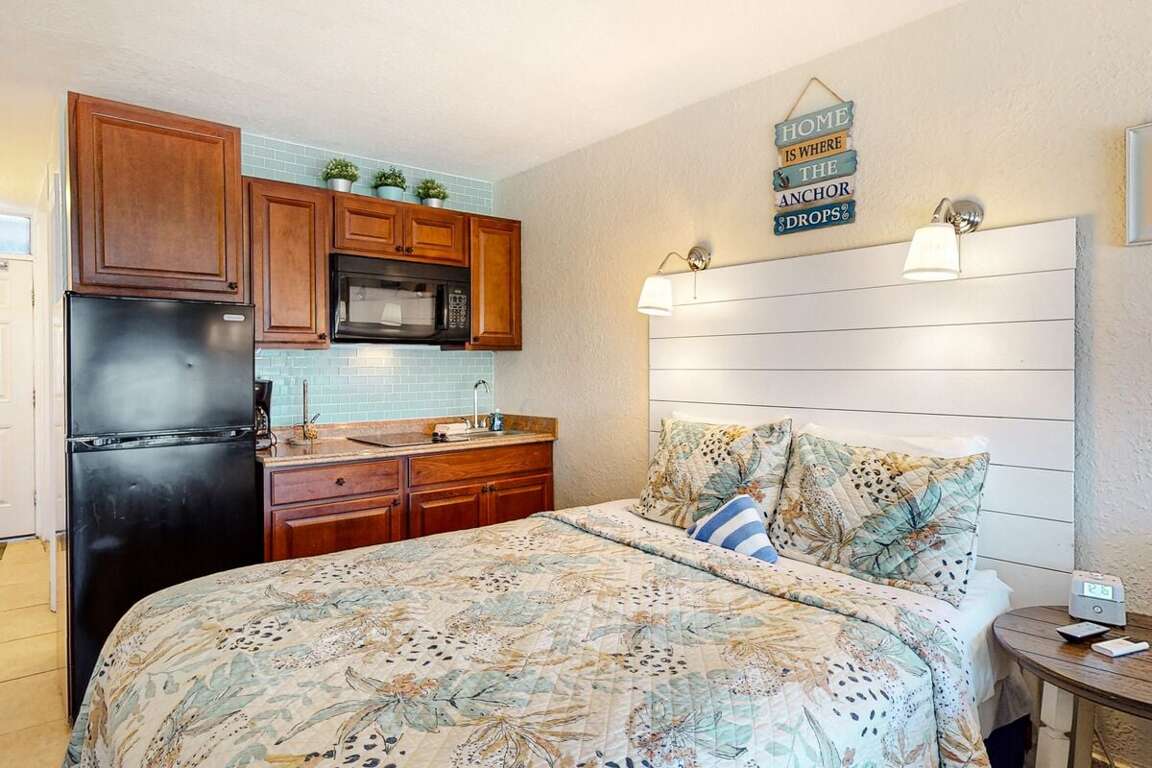 This studio’s efficient kitchenette includes all the basics you need to prepare simple meals or beachside snacks. The fun blue backsplash adds a splash of personality to your mornings.