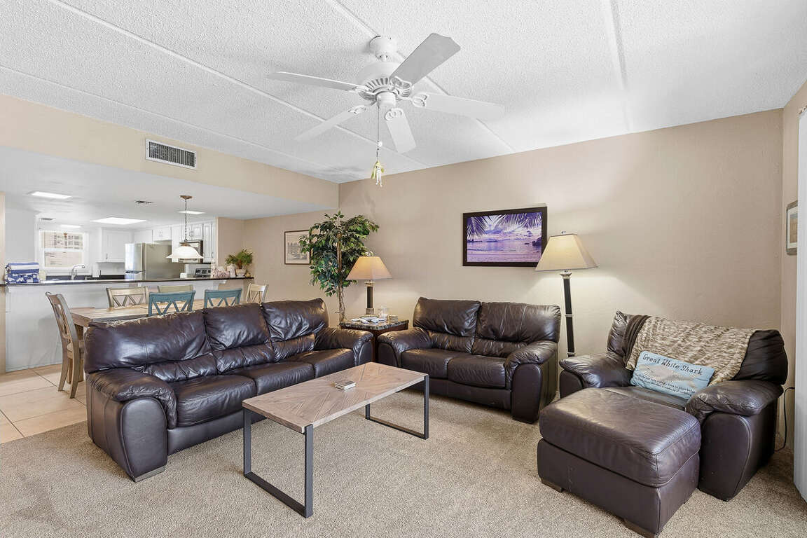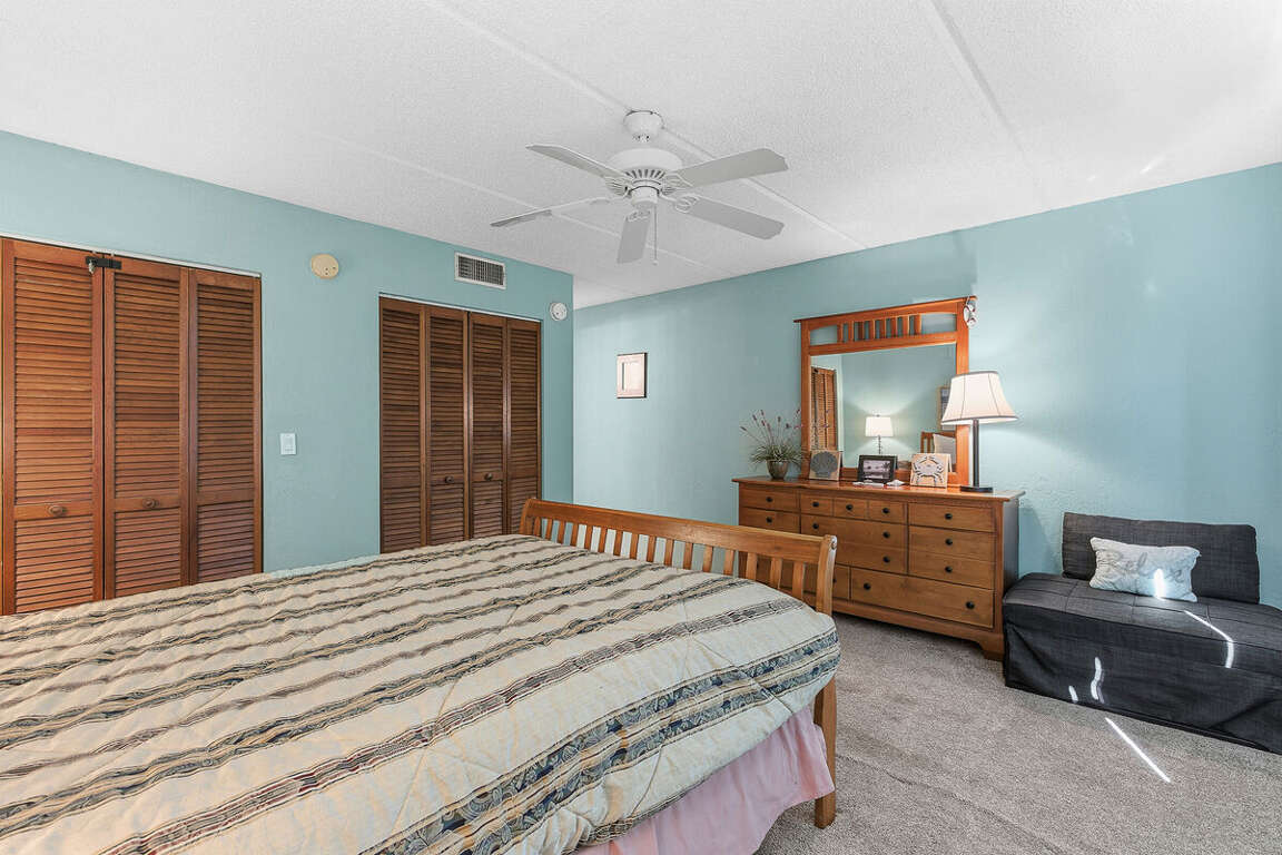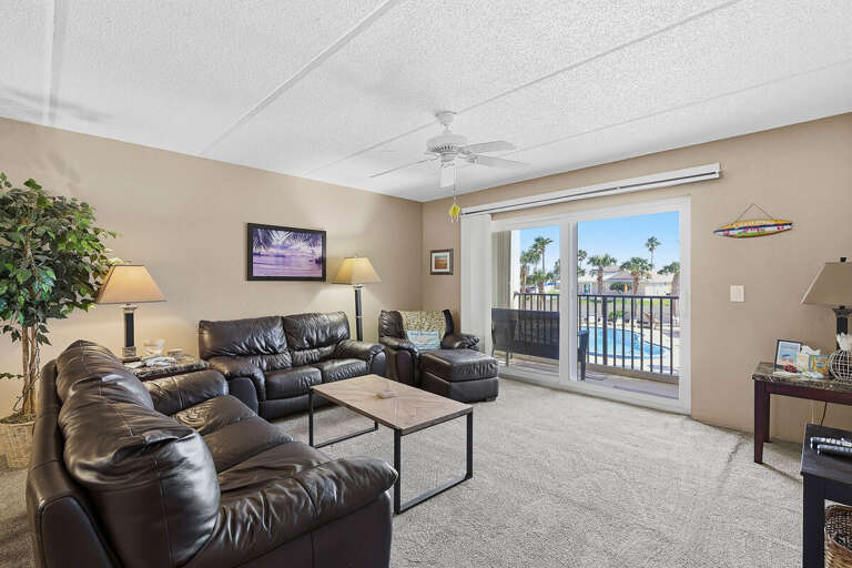 Unwind after a day in the sun in one of two cozy bedrooms, perfect for families or small groups. The living space offers comfy seating, coastal décor, and easy access to the balcony.