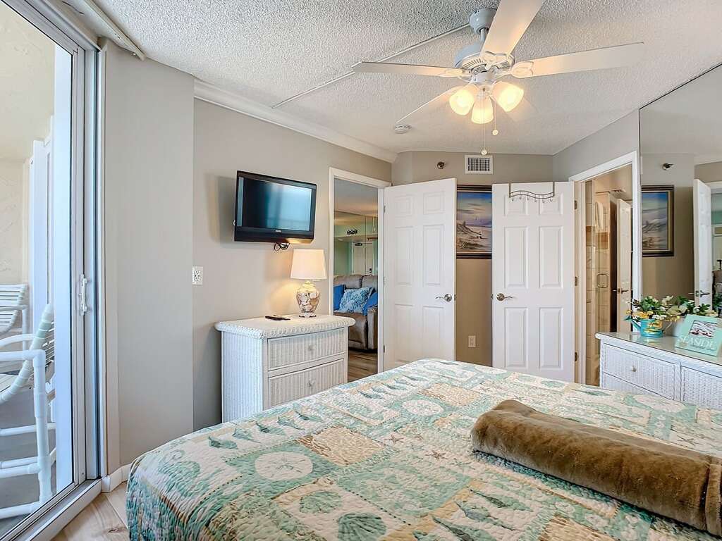 ► Bedroom 1: Queen bed, flat-screen TV, ensuite full bath, direct balcony access<br />