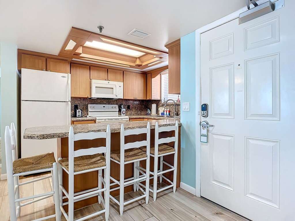► Breakfast bar with 2 stools for quick bites or remote work<br />