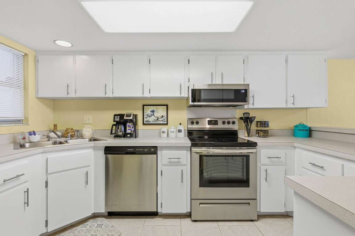 The bright, ocean-view kitchen is fully equipped for meals in. Enjoy stainless steel appliances, a dining table for group meals, and a breakfast bar for casual bites.