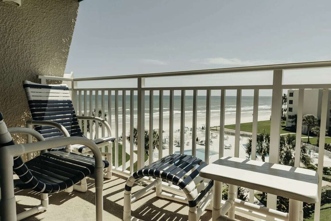 Ocean-view condo rental in New Smyrna Beach with 2 bedrooms, sleeps 6, and direct access to the no-drive beach, plus pools, tennis, and a fitness center.