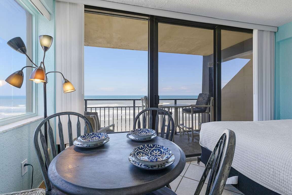 Studio place to stay in Daytona Beach with ocean views, a private balcony, kitchenette, and direct beach access in a beachfront resort; sleeps up to 4.