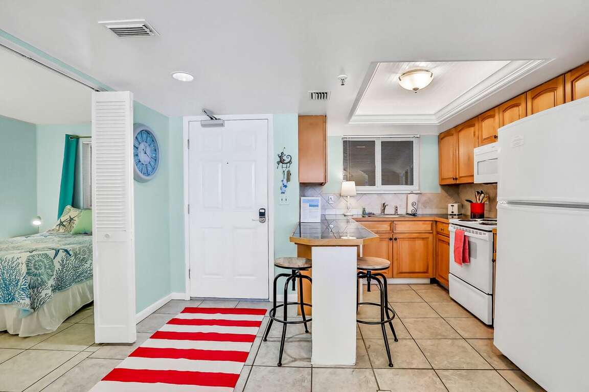 Prepare beach snacks or full meals with ease in the fully equipped kitchen featuring warm wood cabinetry, a breakfast bar, and all major appliances.