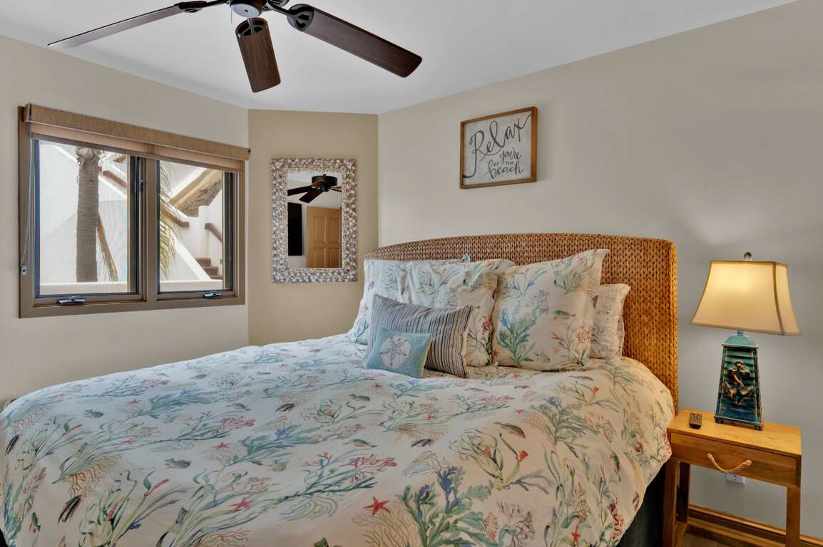The ocean view master bedroom is equipped with a king-sized bed, a 60" smart TV, and remodeled bathroom. HouseManual