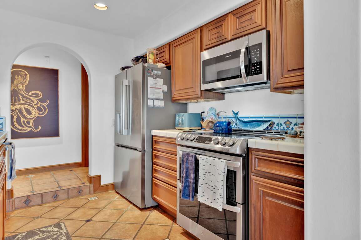 Kitchen and Dining: Prepare delicious dishes in a sparkling kitchen that features custom Catalina tiles, new cookware, and stainless steel appliances. Enjoy a family dinner at the breakfast bar or the spacious breakfast table that opens to the galley-style kitchen.