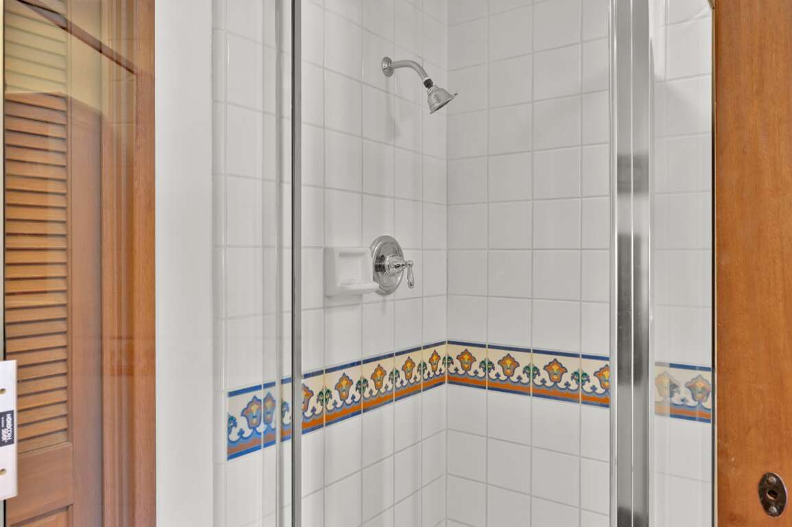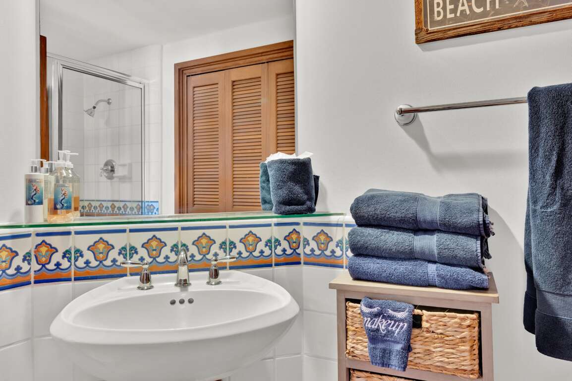 The guest bedroom features a queen-sized bed and a smart TV. The guest bathroom features a pedestal sink with beautiful Catalina tiles and a walk-in shower.