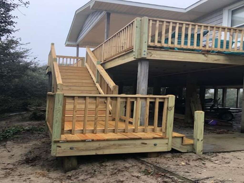 This cute home sits up on a hill with good views of ocean. Very close to beach access. It is a 3 Bedroom, 2 Bath cottage. Bed sizes are 1 queen, 4 twins. Wraparound deck with deck furniture. Rents from Sunday to Sunday and sleeps up to 8. No Pets, No Smoking