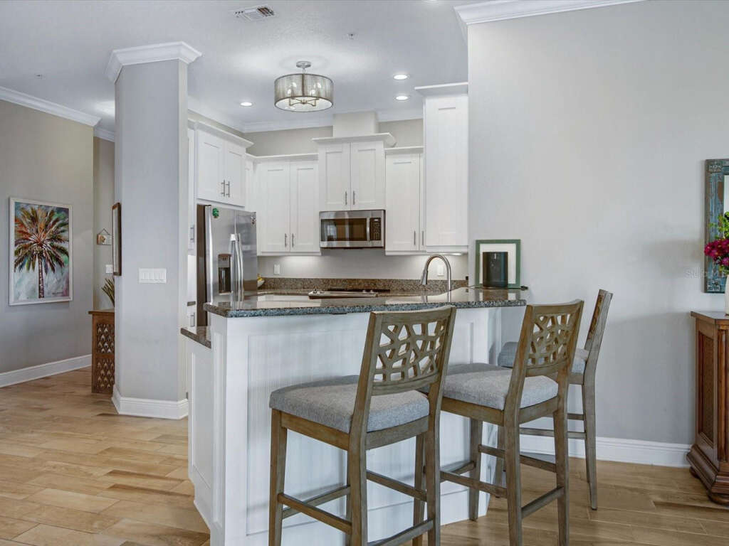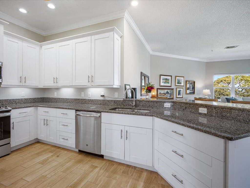 Step inside to a bright, open-concept living space framed by expansive bay views. The chef’s kitchen features premium stainless-steel appliances, granite countertops, custom cabinetry, and a large center island—ideal for easy mornings or relaxed dinners with friends.