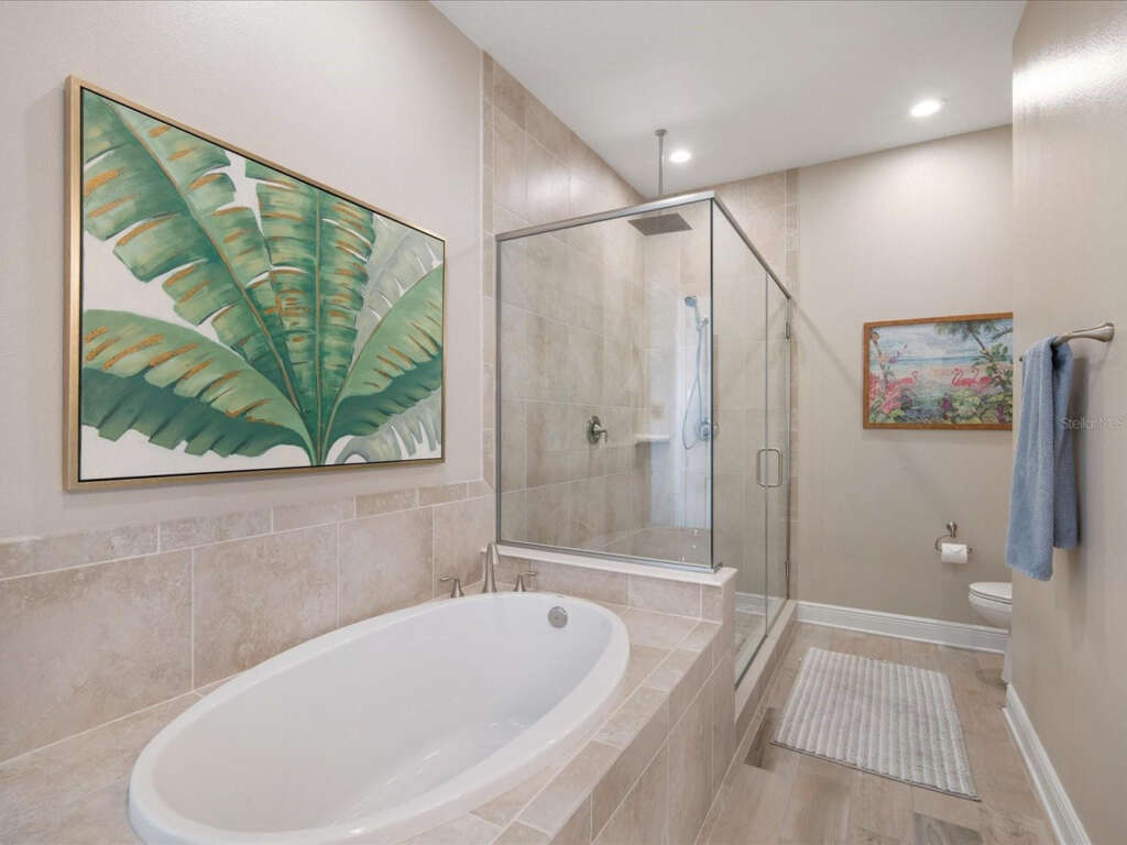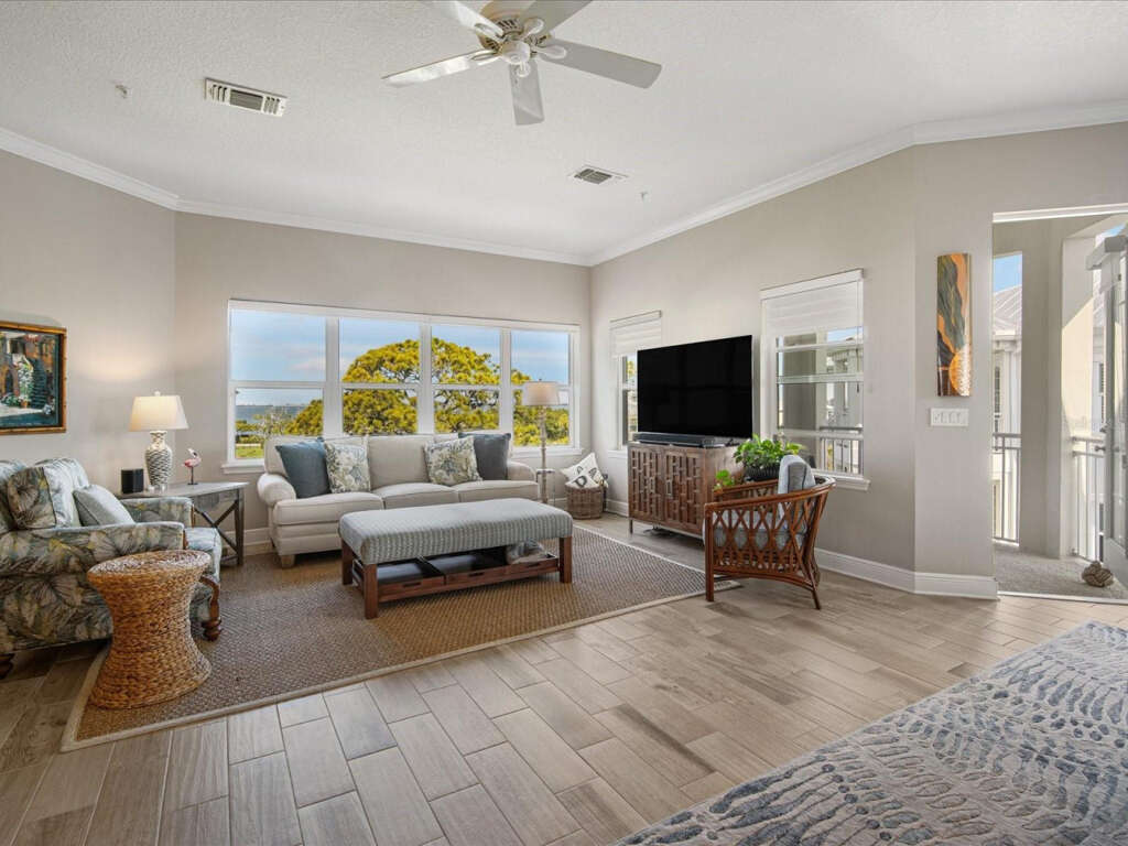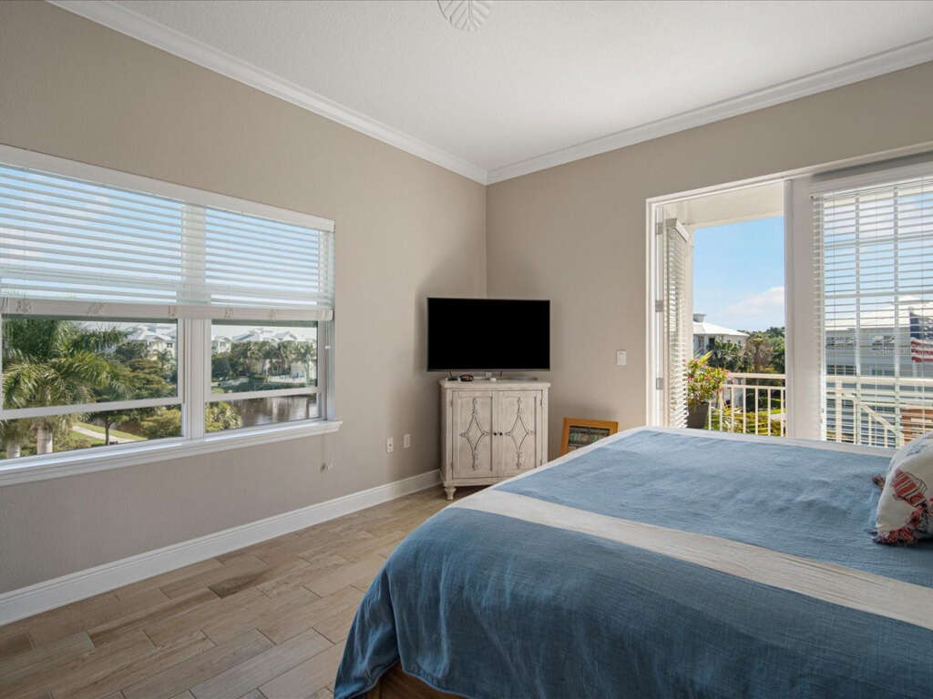 The primary suite is pure relaxation, with its own private balcony, a spa-inspired bath featuring a soaking tub and glass-enclosed rain shower, dual vanities, and a California Closets-designed walk-in. Two additional bedrooms offer privacy and comfort for family or guests, each with thoughtful touches and water views.