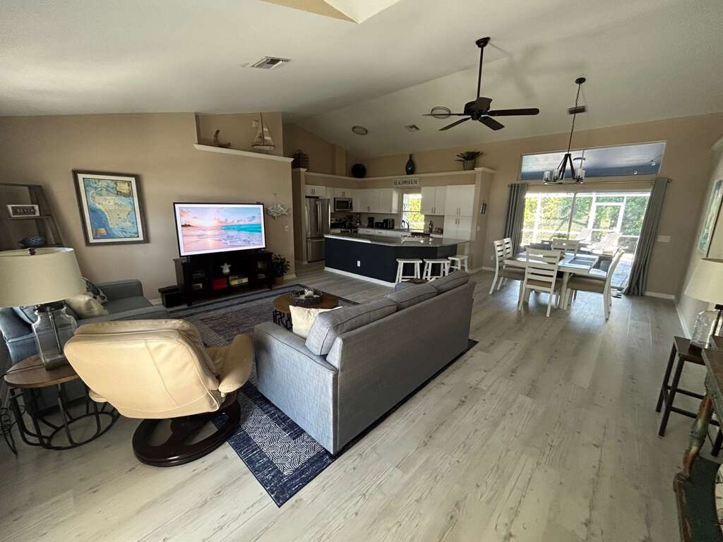 Beautiful 3-bedroom, 2-bath home, minutes from Marco Island's South Beach. Upon entry, appreciate the open floor plan, high-volume ceilings, and beautifully remodeled kitchen. A breakfast bar and open dining room comfortably seat 6 people. The master bedroom boasts a king-size bed with an ensuite, an updated bathroom including an oversized soaking tub, and a custom-tiled shower. This spacious room also enjoys direct access to the lanai and pool. Situated on the opposite side of the home are two guest bedrooms which both enjoy queen-size beds and share a newly updated bathroom with a walk-in shower. Move the fun outside, take a dip in the heated pool or lounge in the sun with the latest bestseller. The lanai also offers outside dining and a flat screen tv for your viewing pleasure. Come take in all the beauty and tranquility that Marco Island has to offer in this lovely home!