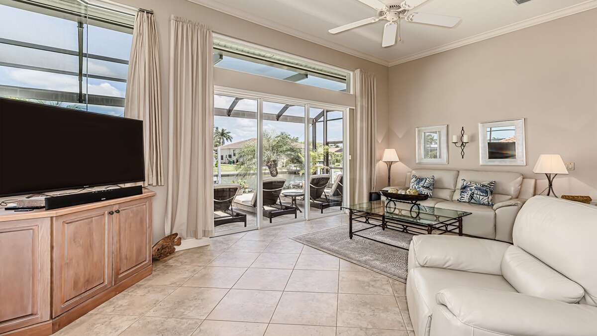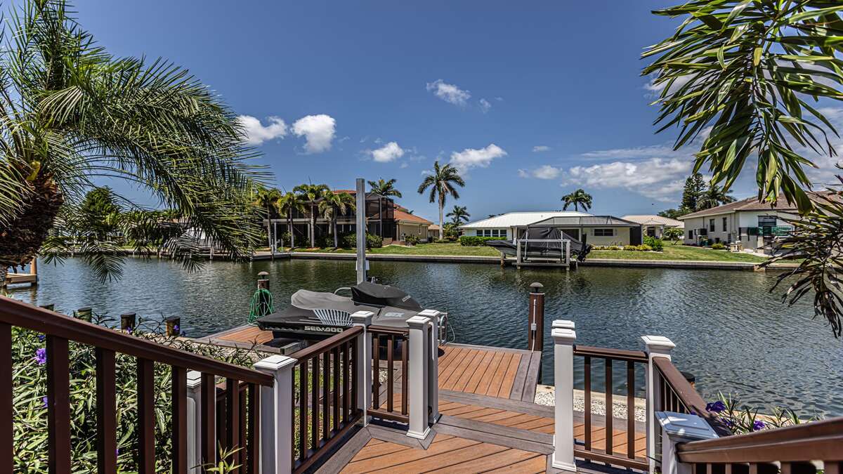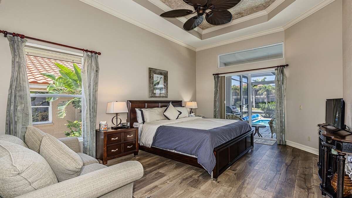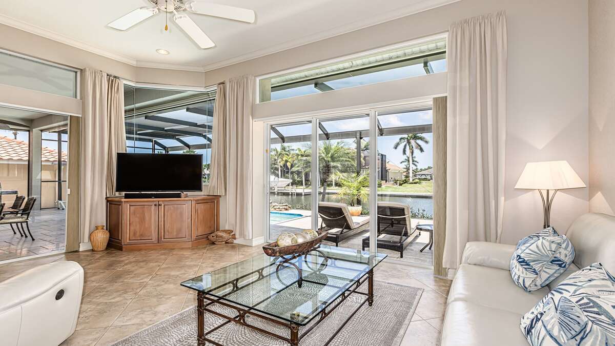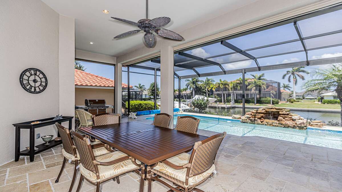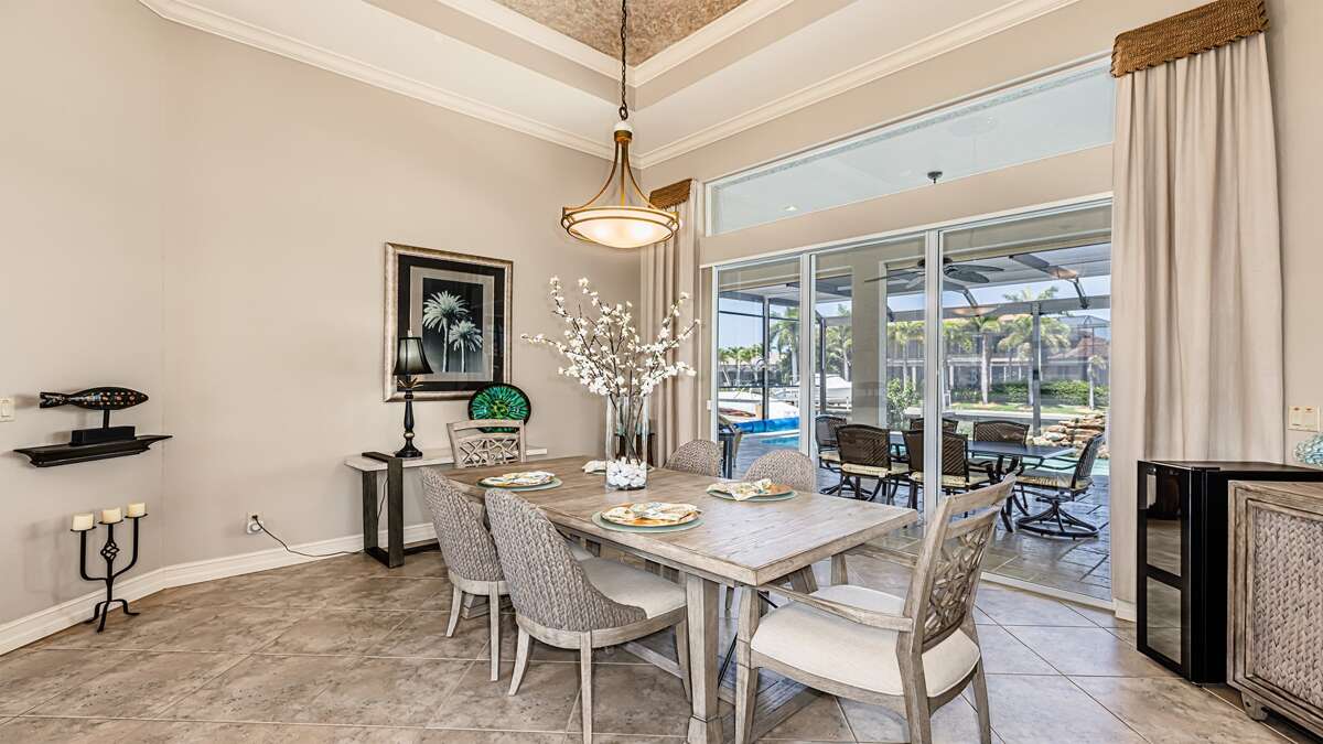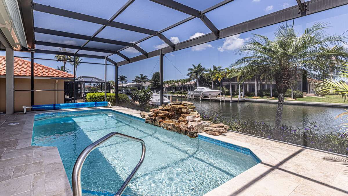 An exceptional 3 bedroom/2 bath waterfront pool home with breathtaking sunset water views Nestled on a quiet cul-de-sac street, this three-bedroom plus office/den, two-full bathroom home spans 2,032 square feet and features an open split floor plan. This home features exquisite professional landscaping and outdoor lighting that enhances its curb appeal. Step through the stately double doors into an inviting foyer and discover soaring ceilings, recessed lighting, crown molding, tile flooring in living areas, luxury vinyl wood flooring in bedrooms, an open floor plan and natural light throughout – creating a seamless and timeless aesthetic. To the right of the foyer, you’ll find a versatile den/study for those on a working vacation. The formal dining area impresses with a tray ceiling and light-filled ambiance courtesy of a nearby glass slider. The heart of the home lies in the adjacent kitchen, equipped with stainless appliances, wood cabinetry with under-lighting, quartz and stone countertops, and a large center island. with stainless steel appliances. A pantry provides ample storage, while the kitchen opens gracefully into the family room, where panoramic windows and dual glass sliders frame the sparkling pool and canal views. The primary bedroom suite is a tranquil escape with a king bed, a French door entry, a glass slider for private lanai access, a tray ceiling, luxury vinyl wood plank floors, and a spacious walk-in closet with built-in cabinets. The en-suite bathroom boasts his and her vanities, a makeup counter, framed full-width mirrors, a deep soaker tub, and a walk-in shower. Two additional guest bedrooms are generously sized, one king and one queen and share a full bathroom with a walk-in shower with stylish “barn-door” door. All bedrooms have TV's. Step outside to the lanai, a true haven for outdoor living, featuring travertine flooring, a heated pool with a serene water feature, and a picture window screen enclosure. Lounge by the pool while enjoying sunset cocktails and grilling your fresh catch.